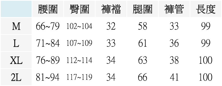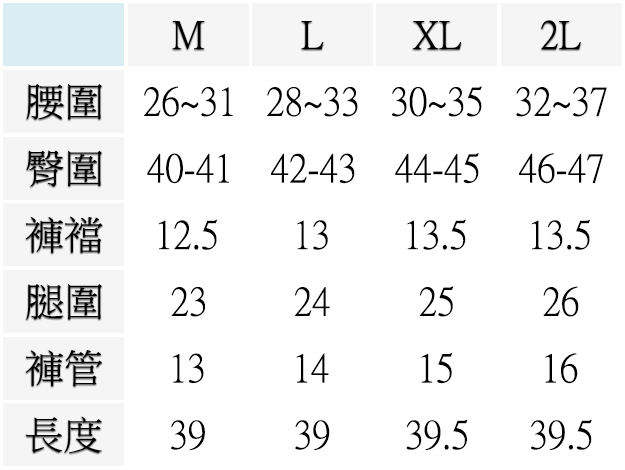 M ( 腰圍26~31英吋 / 66~69公分 ), L ( 腰圍28~33英吋 / 71~84公分 ), XL ( 腰圍30~35英吋 / 76~89公分 ), 2L ( 腰圍32~37英吋 / 81~94公分 )