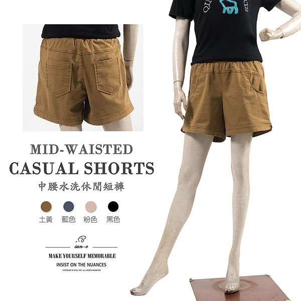 sun-e水洗休閒短褲、中腰超彈力短褲、鬆緊腰休閒褲、素面短褲、黑色短褲、Mid-Waisted Casual Shorts、Elastic Waist Shorts (012-4319-06)粉色、(012-4319-08)藍色、(012-4319-15)土黃、(012-4319-21)黑色 M L (腰圍:28~33英吋 / 71~84公分) 女 [實體店面保障]