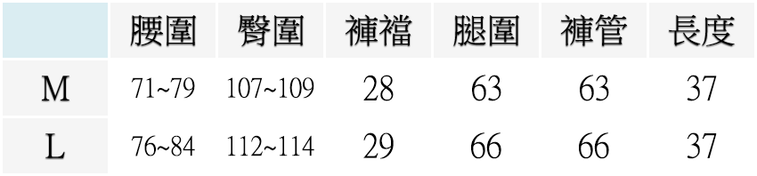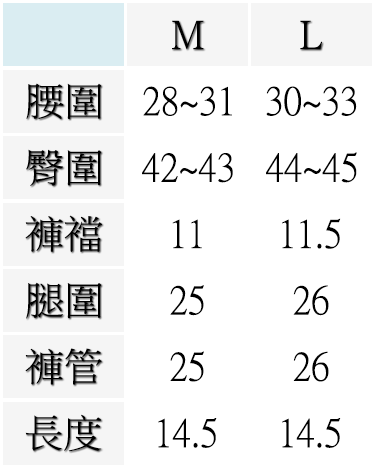 M ( 腰圍28~31英吋 / 71~79公分 ), L ( 腰圍30~33英吋 / 76~84公分 )