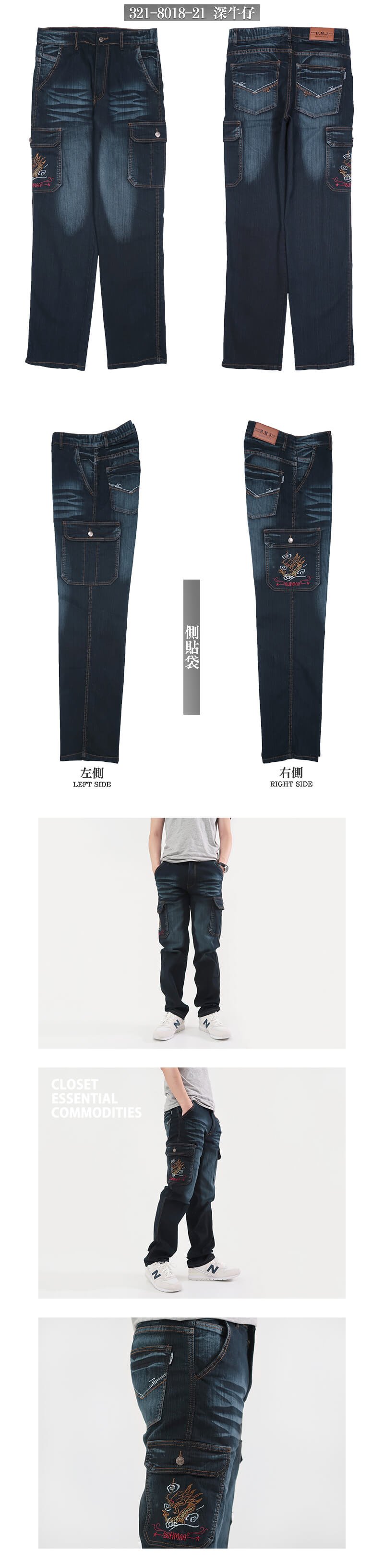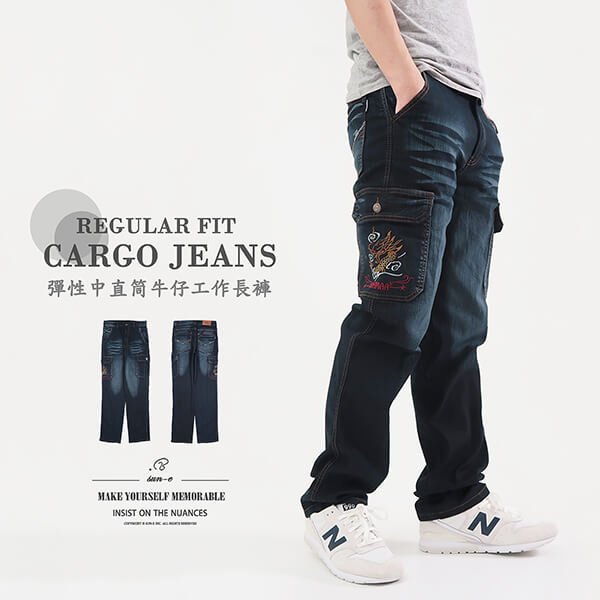 sun-e牛仔工作褲、繡龍多口袋牛仔褲、貓爪刷白側貼袋牛仔長褲、中直筒彈性牛仔褲、丹寧工作長褲、直筒褲、單寧、口袋褲、工裝褲、車繡後口袋、車繡側貼袋、Mens Jeans、Regular Fit Cargo Jeans、Cargo Pants、Stretch Denim Pants、Dragon Embroidery Cargo Pockets (321-8018-21)深牛仔 L XL 2L 3L 4L 5L(腰圍:76~104公分 / 30~41英吋) 男 [實體店面保障]