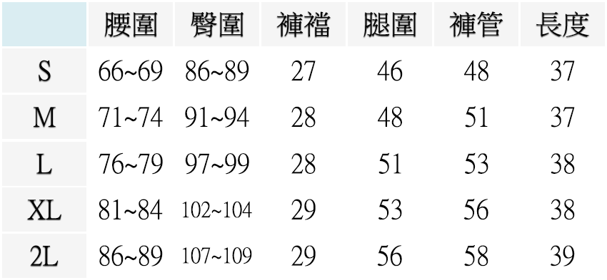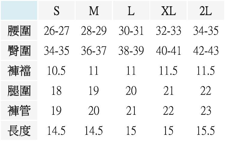 S ( 腰圍26-27英吋 / 66~69公分), M ( 腰圍28-29英吋 / 71~74公分), L ( 腰圍30-31英吋 / 76~79公分), XL ( 腰圍32-33英吋 / 81~84公分), 2L ( 腰圍34-35英吋 / 86~89公分)