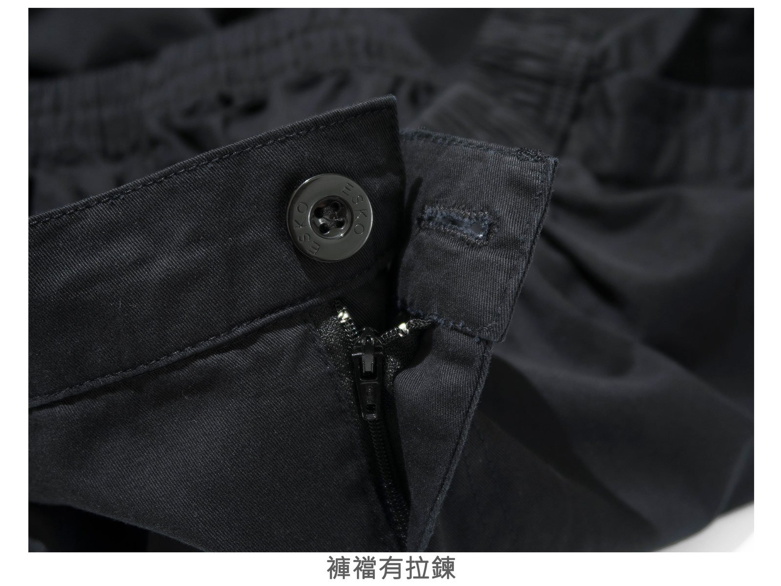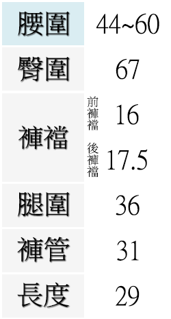 腰圍有皮帶環(褲耳),褲檔有拉鍊。