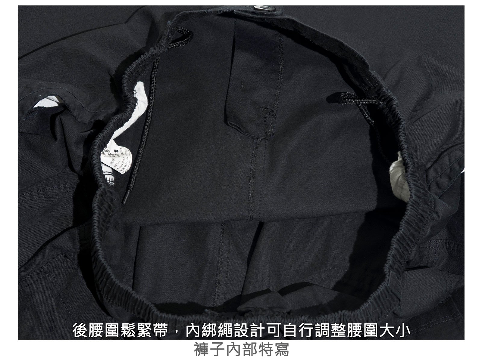 後腰圍鬆緊帶,內綁繩設計可自行調整腰圍大小。