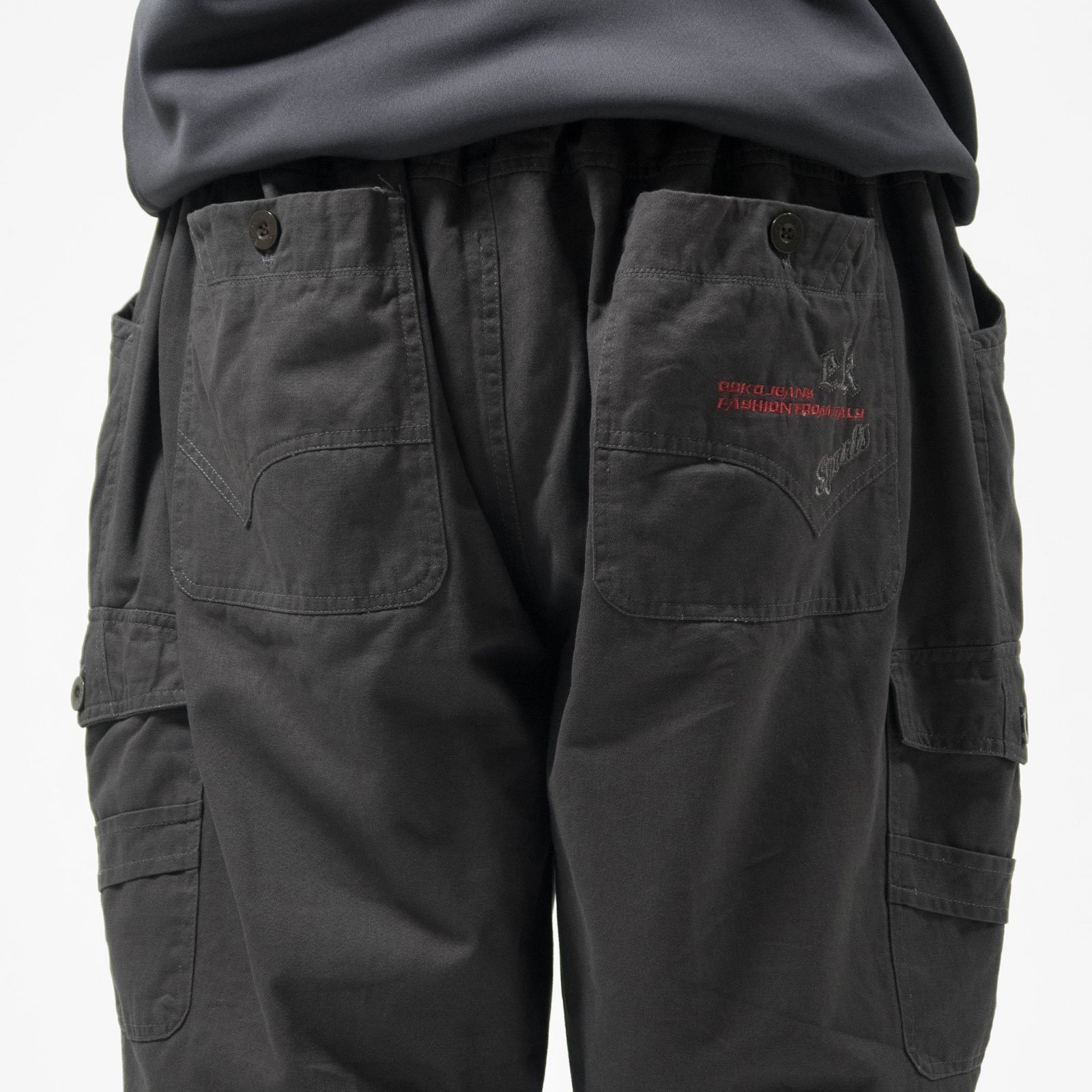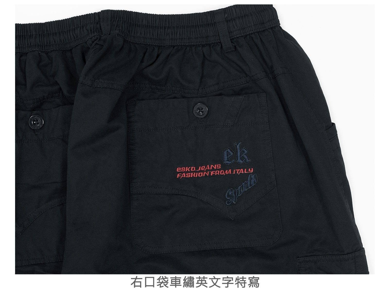 後:左、右各一鈕扣口袋,右口袋車繡英文字。