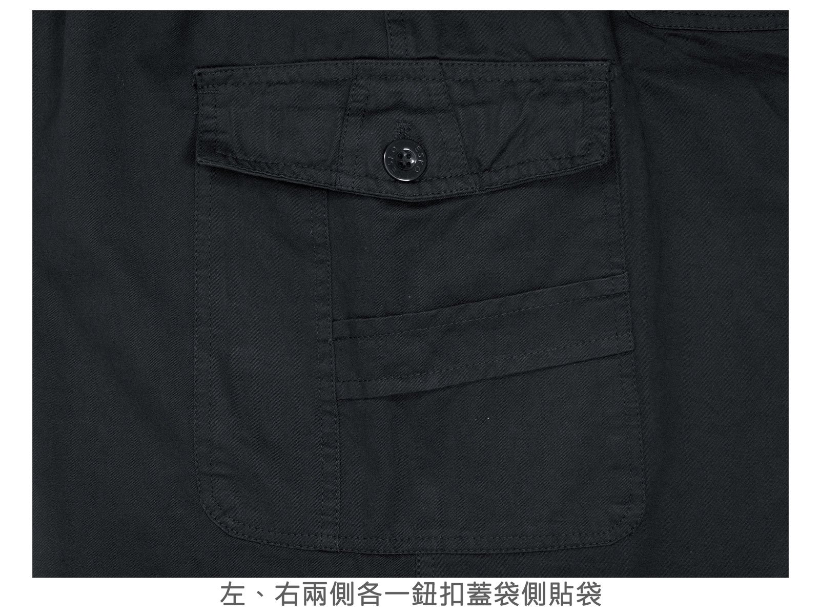 左、右兩側各一鈕扣蓋袋側貼袋。