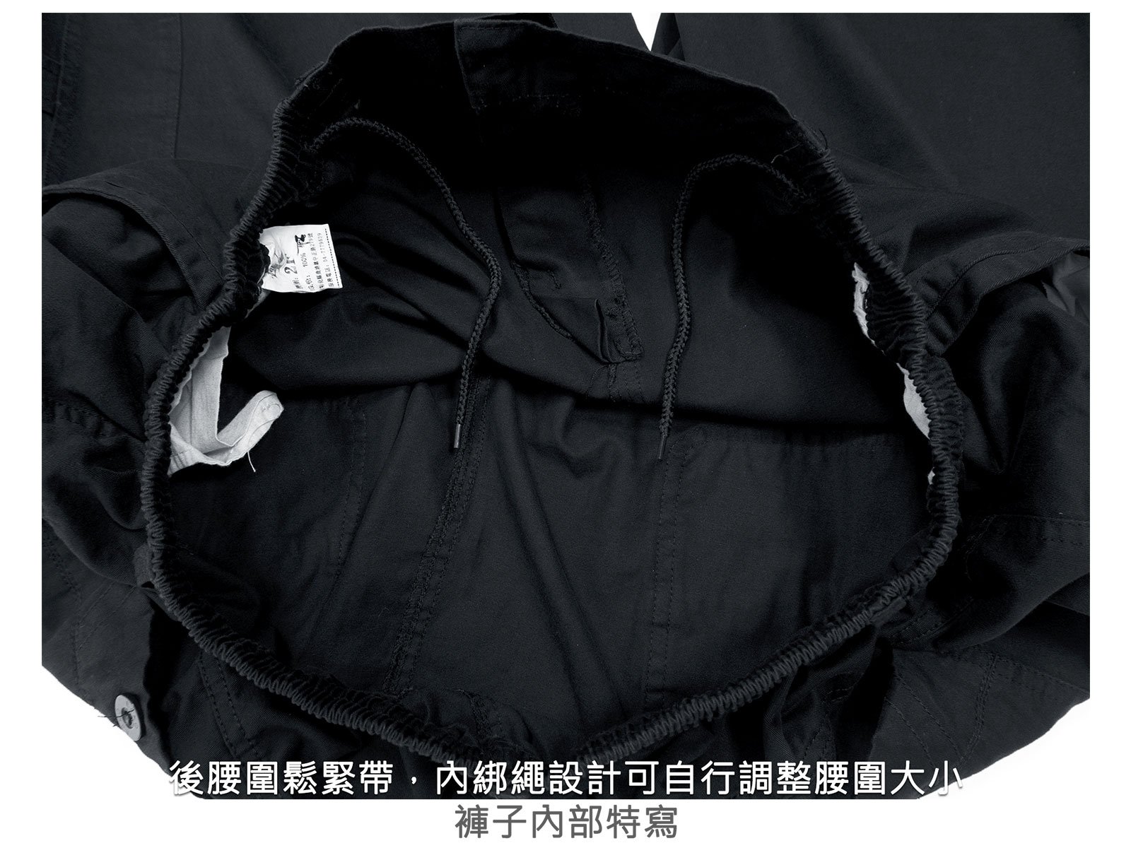 後腰圍鬆緊帶,內綁繩設計可自行調整腰圍大小。