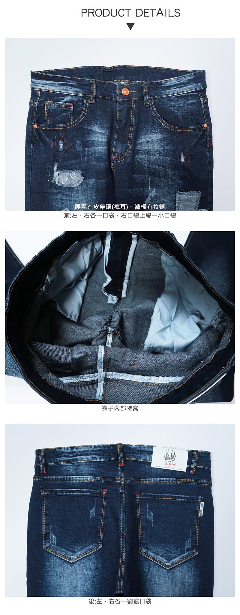 褲管補丁貼布、割破、磨破、縫線、膠印英文字。