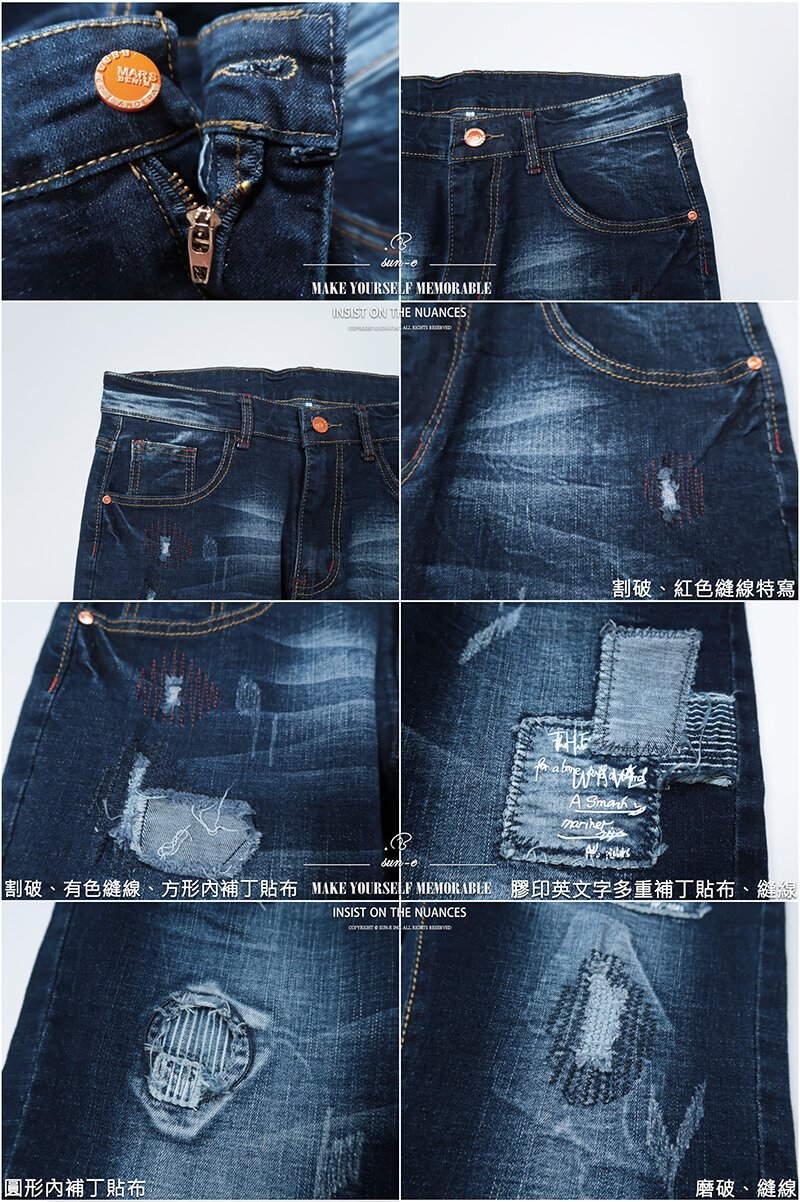 sun-e補丁貼布窄管牛仔褲、顯瘦磨破牛仔長褲、割破修身破褲、貓爪刷白牛仔褲、彈性丹寧、潮流個性長褲、割痕後口袋、單寧、Skinny Stretch Patch Jeans、Slim fit Denim (329-3583-08)深牛仔 腰圍:M L XL 2L(28~35英吋) 男 [實體店面保障]