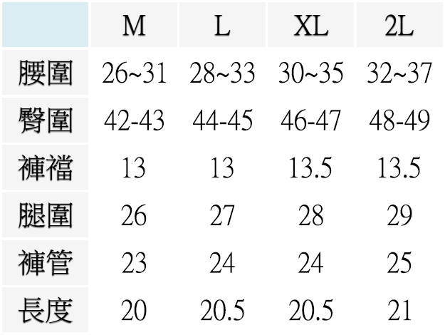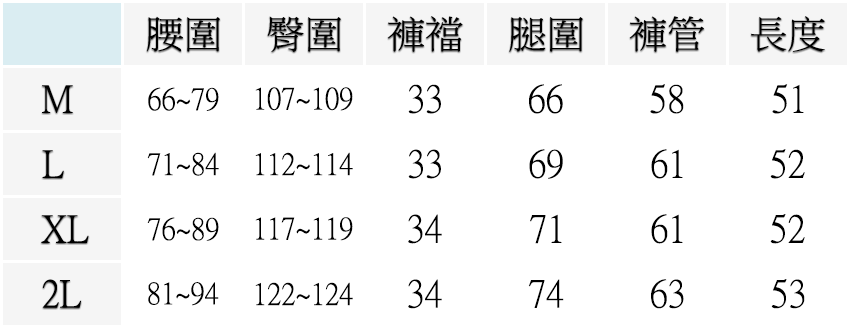 M ( 腰圍26~31英吋 / 66~79公分 ), L ( 腰圍28~33英吋 / 71~84公分 ), XL ( 腰圍30~35英吋 / 76~89公分 ), 2L ( 腰圍32~37英吋 / 81~94公分 )