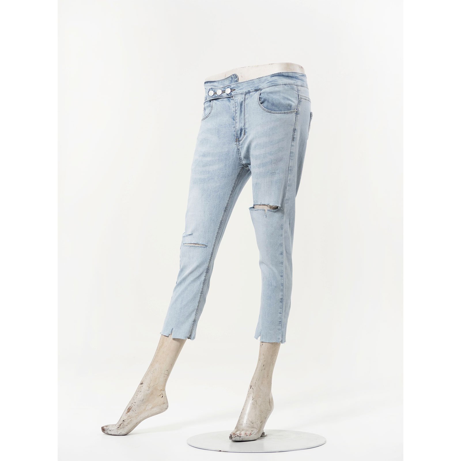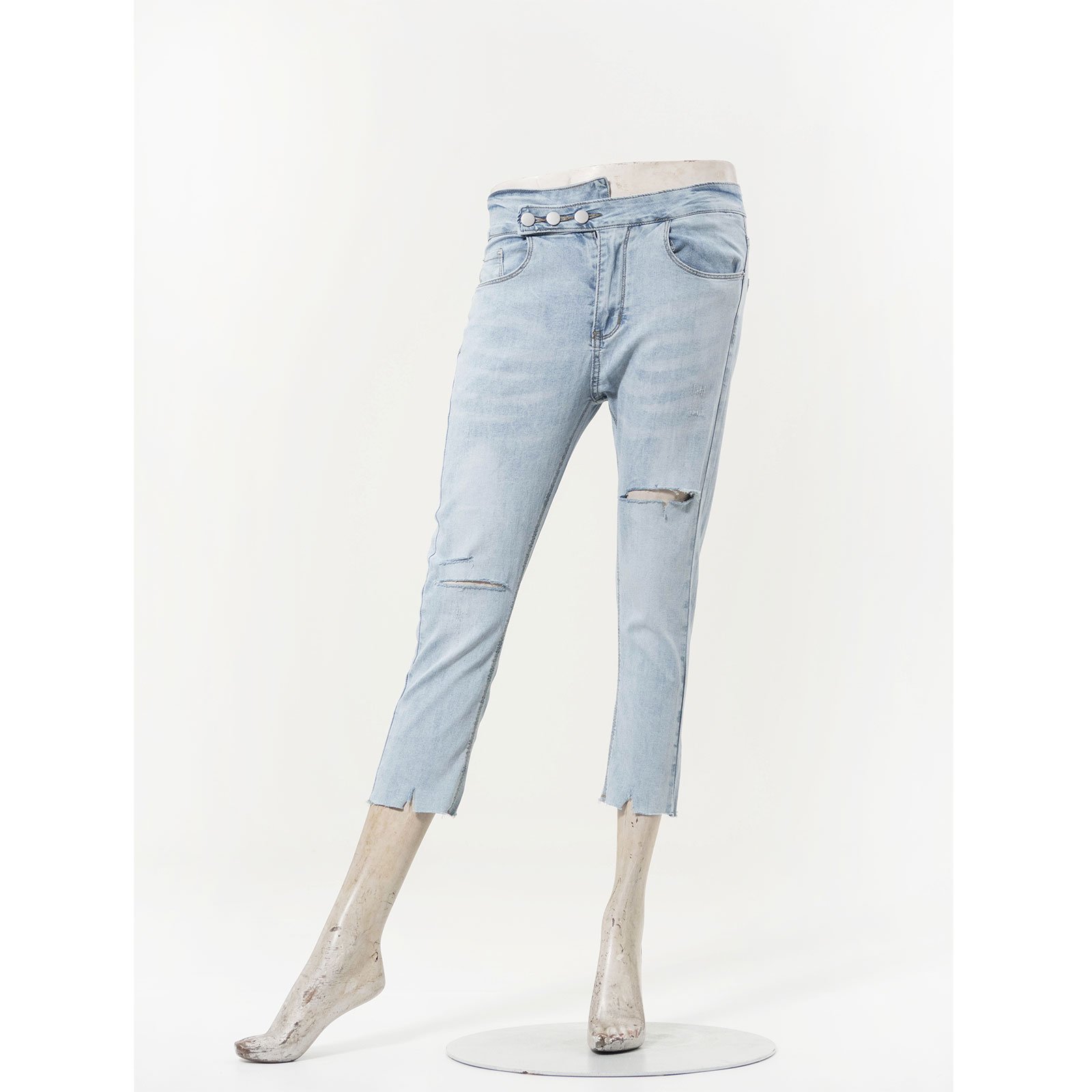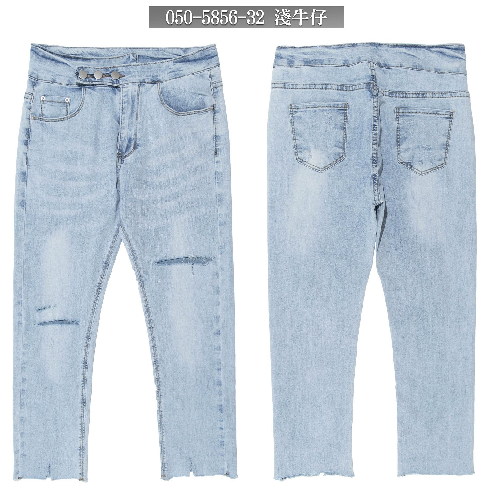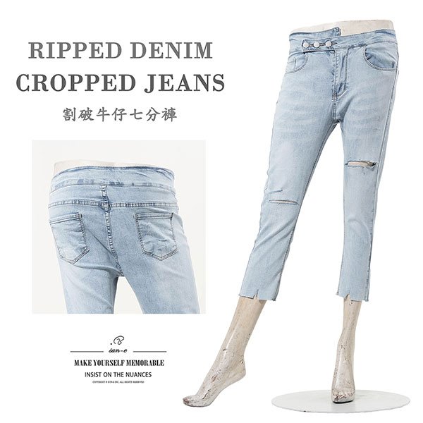 sun-e超輕薄牛仔七分褲、七分牛仔褲、割破丹寧長褲、鬚邊割破褲、不修邊牛仔褲、彈性顯瘦長褲、Ripped Cropped Jeans、Lightweight Denim、Stretch Jean Pants、Frayed Hem Of The Jeans、Slimming Jeans (050-5856-32)淺牛仔 S M L XL (腰圍:66~84公分 / 26~33英吋) 女 [實體店面保障]