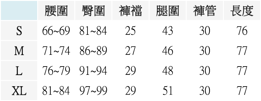 S ( 腰圍26-27英吋 / 66~69公分 ), M ( 腰圍28-29英吋 / 71~74公分 ), L ( 腰圍30-31英吋 / 76~79公分 ), XL ( 腰圍32-33英吋 / 81~84公分 )