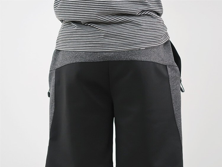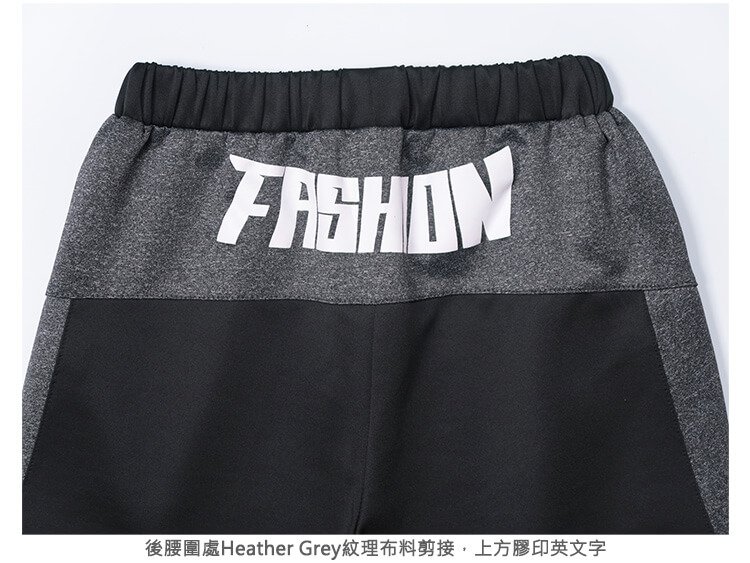 後:腰圍處配色布料剪接,上方膠印英文字。