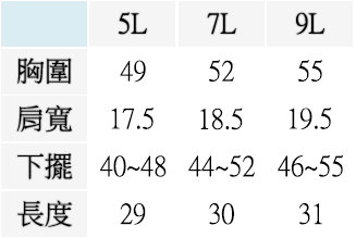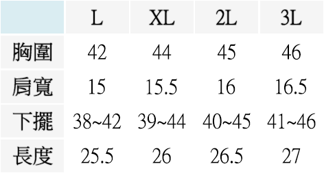L (胸圍:42英吋), XL (胸圍:44英吋), 2L (胸圍:45英吋), 3L (胸圍:46英吋)