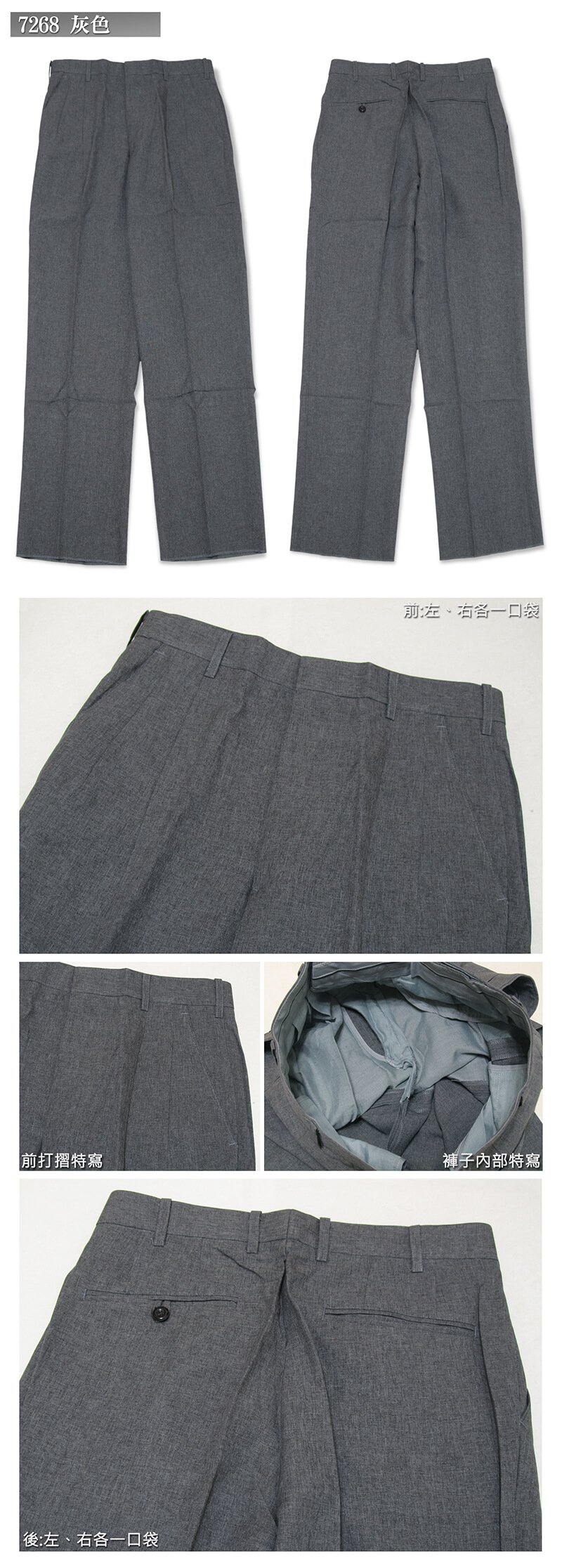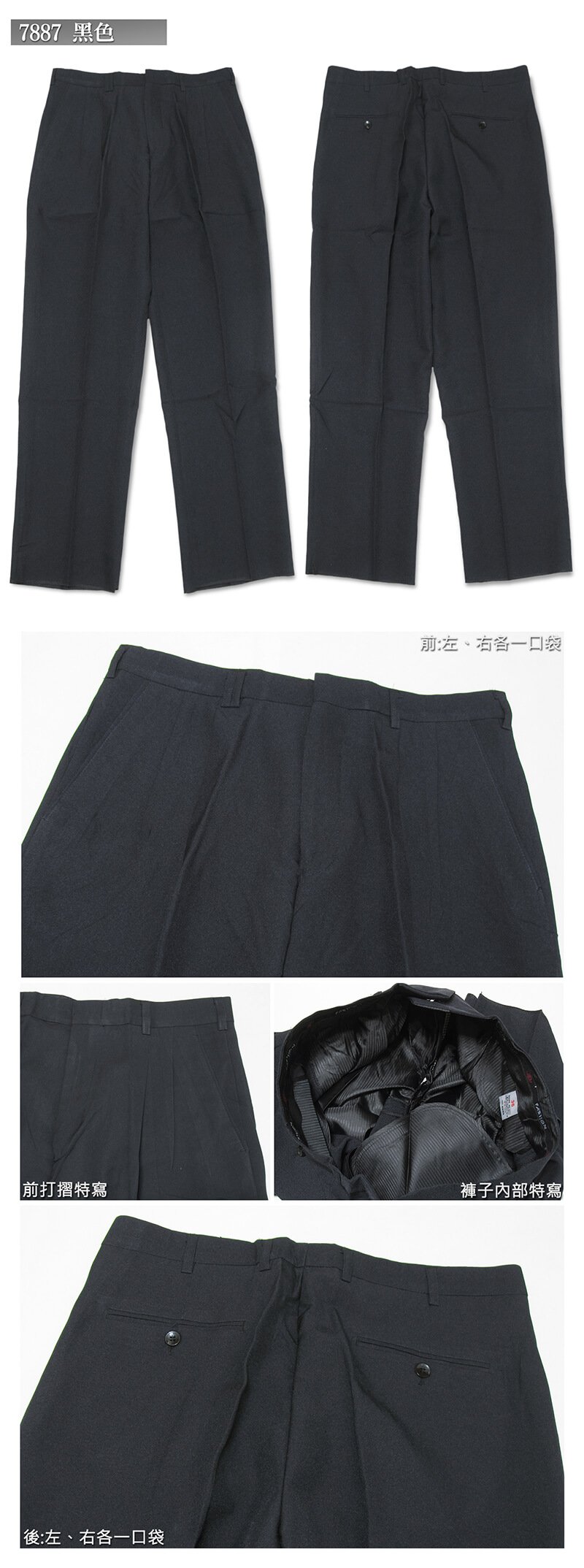 腰圍有皮帶環(褲耳)、褲檔有拉鍊。