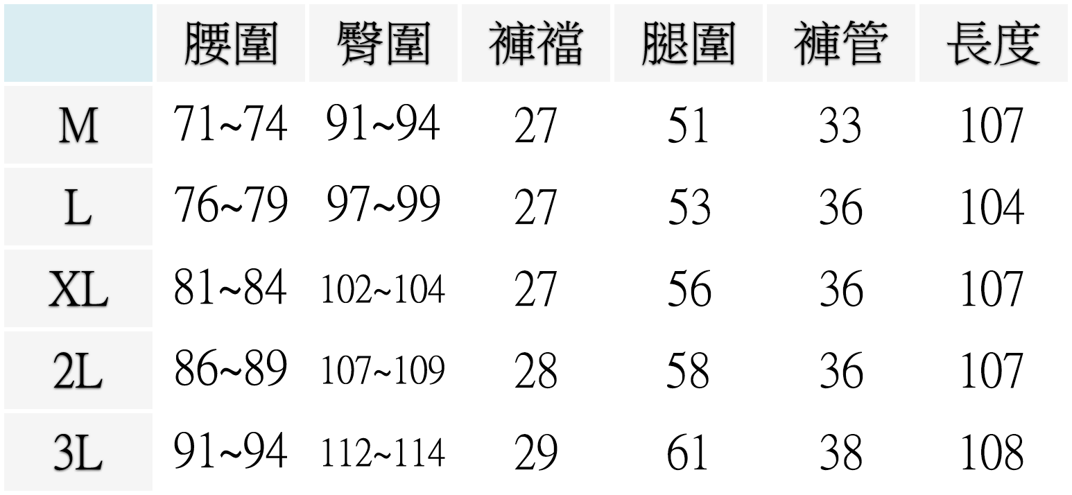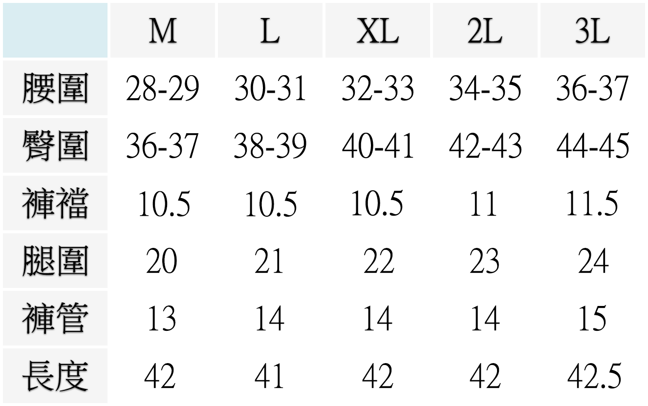 M ( 腰圍28-29英吋 / 71~74公分 ), L ( 腰圍30-31英吋 / 76~79公分 ), XL ( 腰圍32-33英吋 / 81~84公分 ), 2L ( 腰圍34-35英吋 / 86~89公分 ), 3L ( 腰圍36-37英吋 / 91~94公分 )