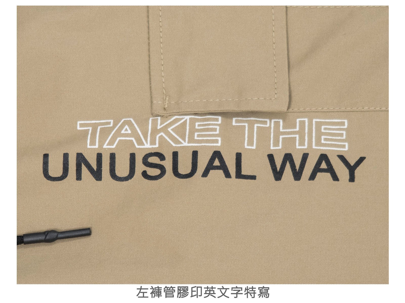 左褲管膠印英文字。