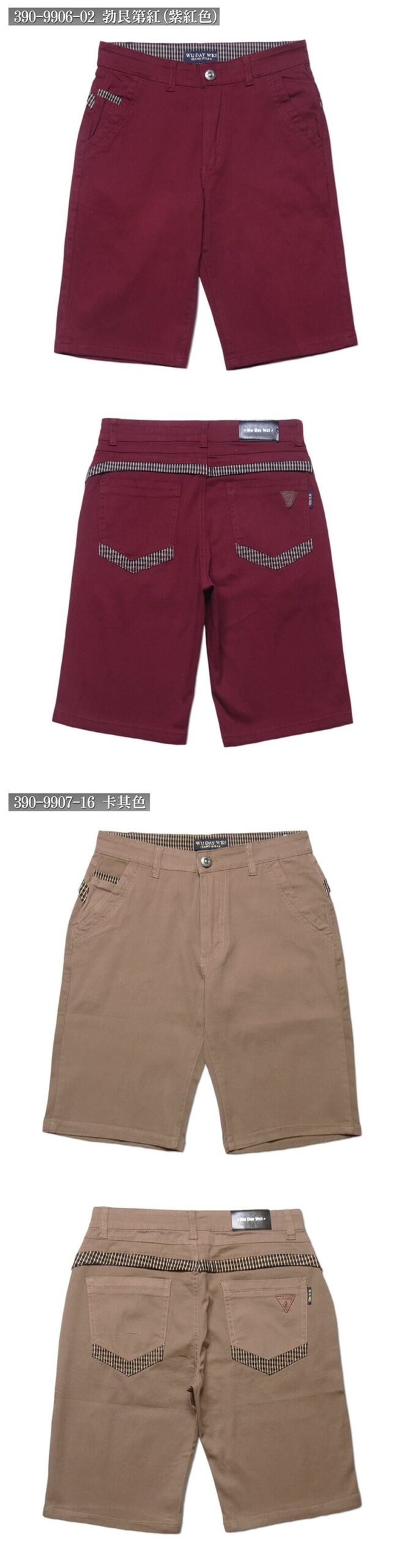 sun-e顯瘦韓版短褲、彈性五分褲、休閒短褲、涼爽短褲、配色格紋剪接、卡其短褲、SHORT PANTS、CASUAL SHORTS (390-9906-02)紫紅色、(390-9907-16)卡其色 腰圍:M L XL 2L 3L 4L(28~39英吋) [實體店面保障] {零碼清倉}