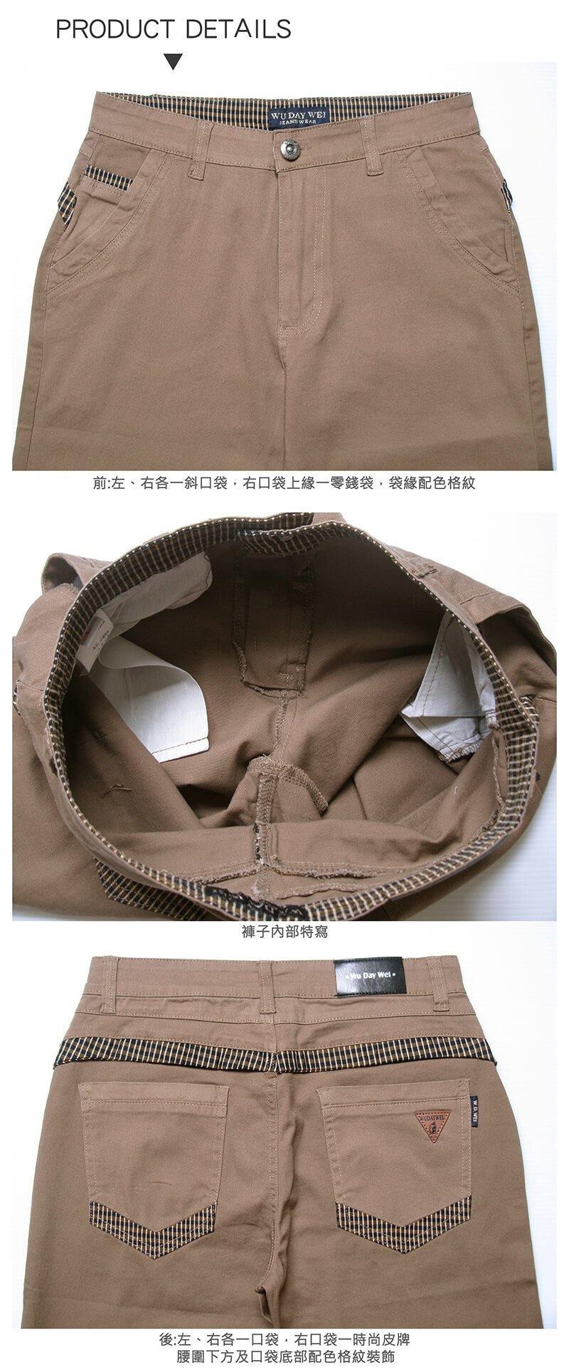 腰圍有皮帶環(褲耳),褲檔有拉鍊。