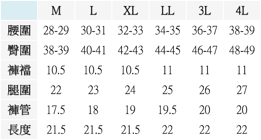 M(腰圍:28-29英吋), L(腰圍:30-31英吋), XL(腰圍:32-33英吋), 2L(腰圍:34-35英吋), 3L(腰圍:36-37英吋), 4L(腰圍:38-39英吋)