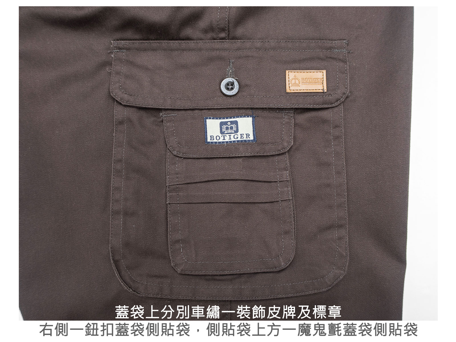 右側一鈕扣蓋袋側貼袋,側貼袋上方一魔鬼氈蓋袋側貼袋;