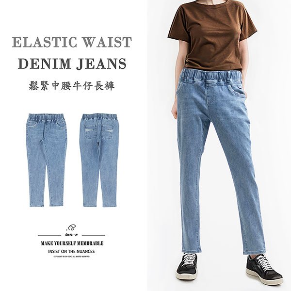 時尚舒適鬆緊腰牛仔褲,彈性丹寧布料活動自如不束縛,