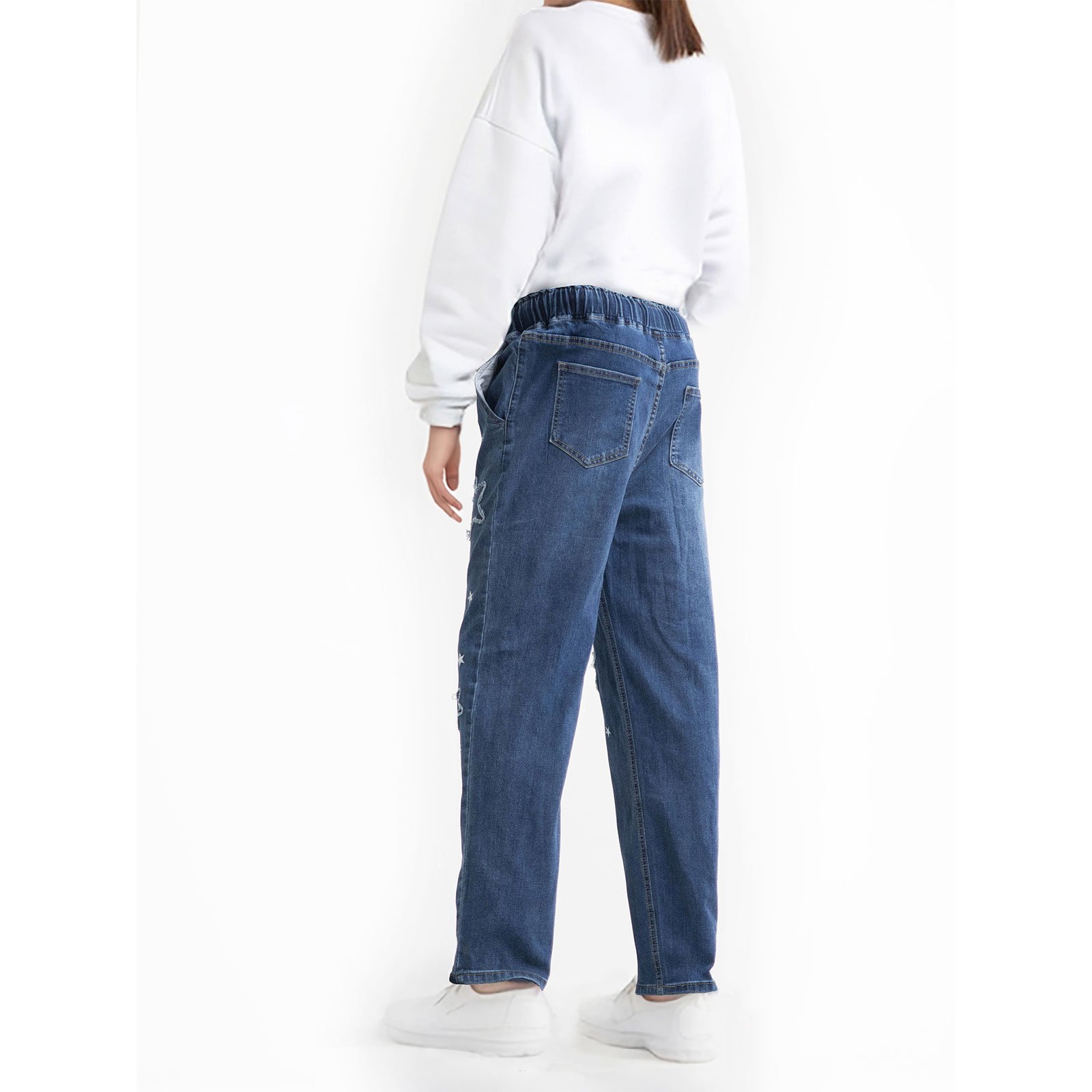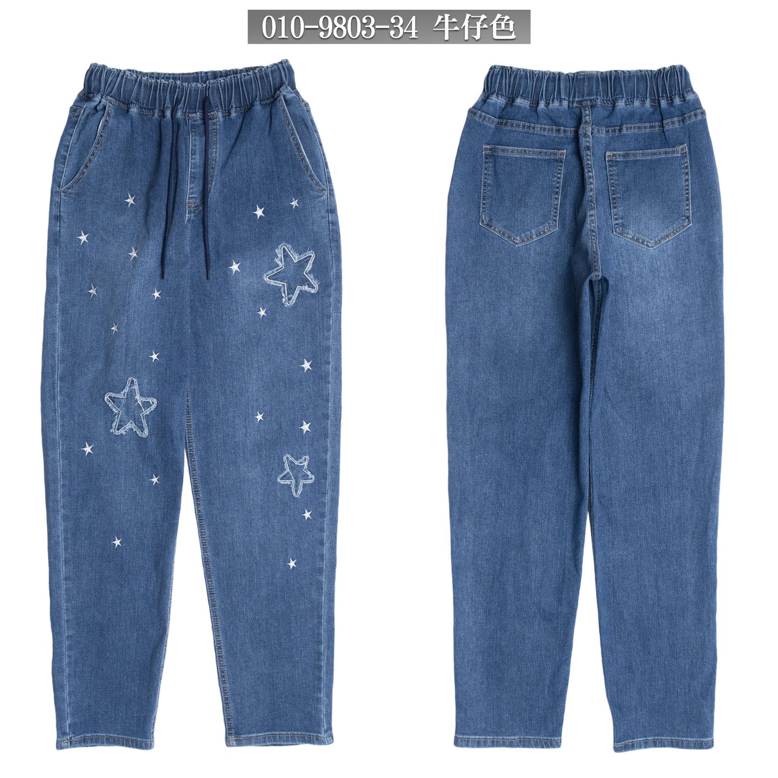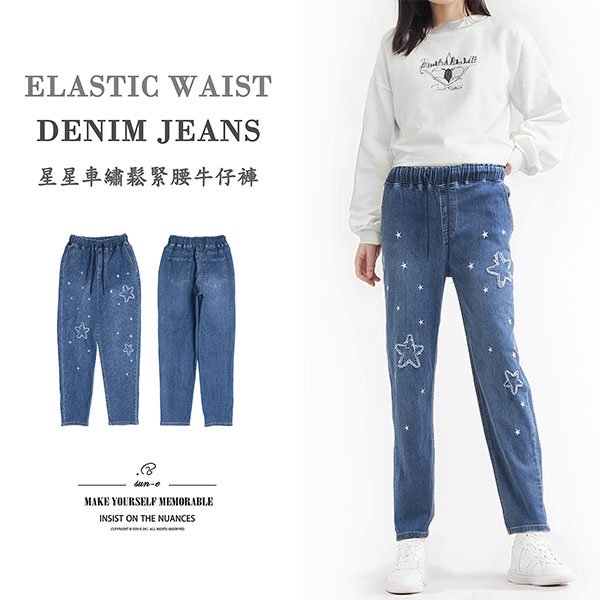 浪漫星星車繡設計鬆緊腰牛仔褲,採用優質彈性丹寧布料,