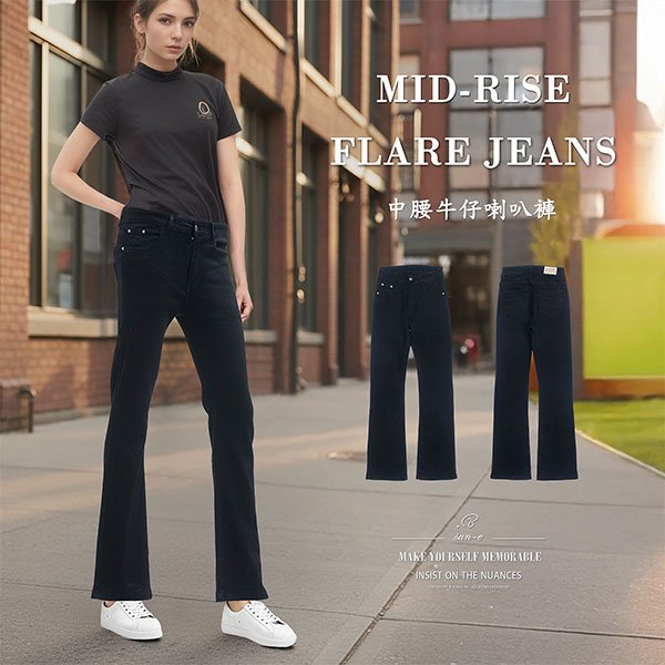 素面百搭中腰牛仔喇叭褲,彈性丹寧布料耐穿透氣,