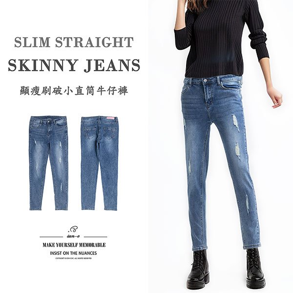 ![顯瘦小直筒牛仔褲 刷破牛仔長褲 彈性丹寧 割破牛仔褲 刷紋刷白牛仔褲 修身直筒褲 小直筒版型修飾腿型更顯修長 Slim Fit Skinny Jeans Stretch Denim Pants Ripped Jeans、Distressed Faded Jeans Straight-Leg Trousers (050-6116-34)牛仔色 S M L XL (腰圍:26~33英吋 / 66~84公分) 女 [實體店面保障] sun-e:圖片 2](https://sune1984.com/wp-content/uploads/2026/03/050-6116-34_P1.jpg)
