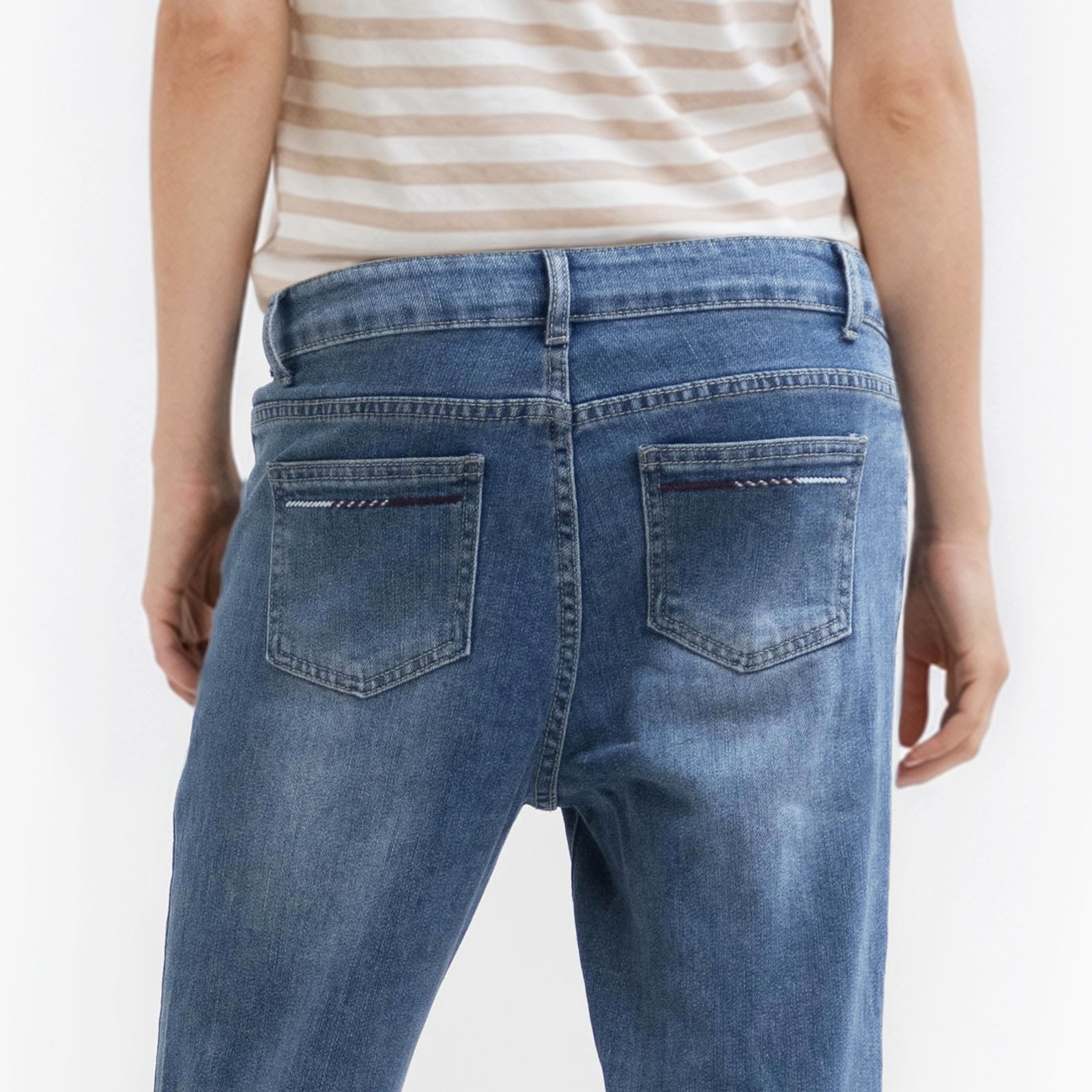 褲身顯瘦刷白,丹寧布料伸縮有彈性。