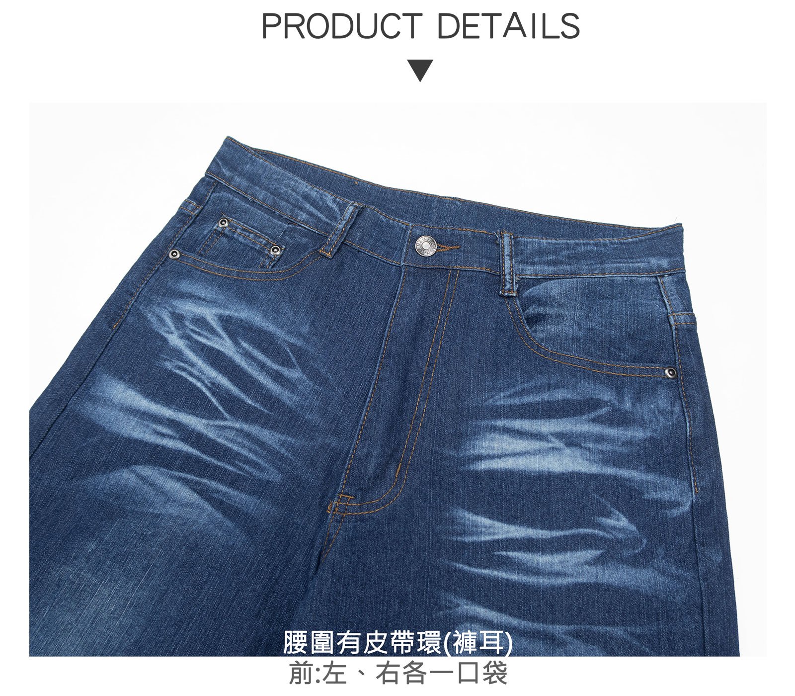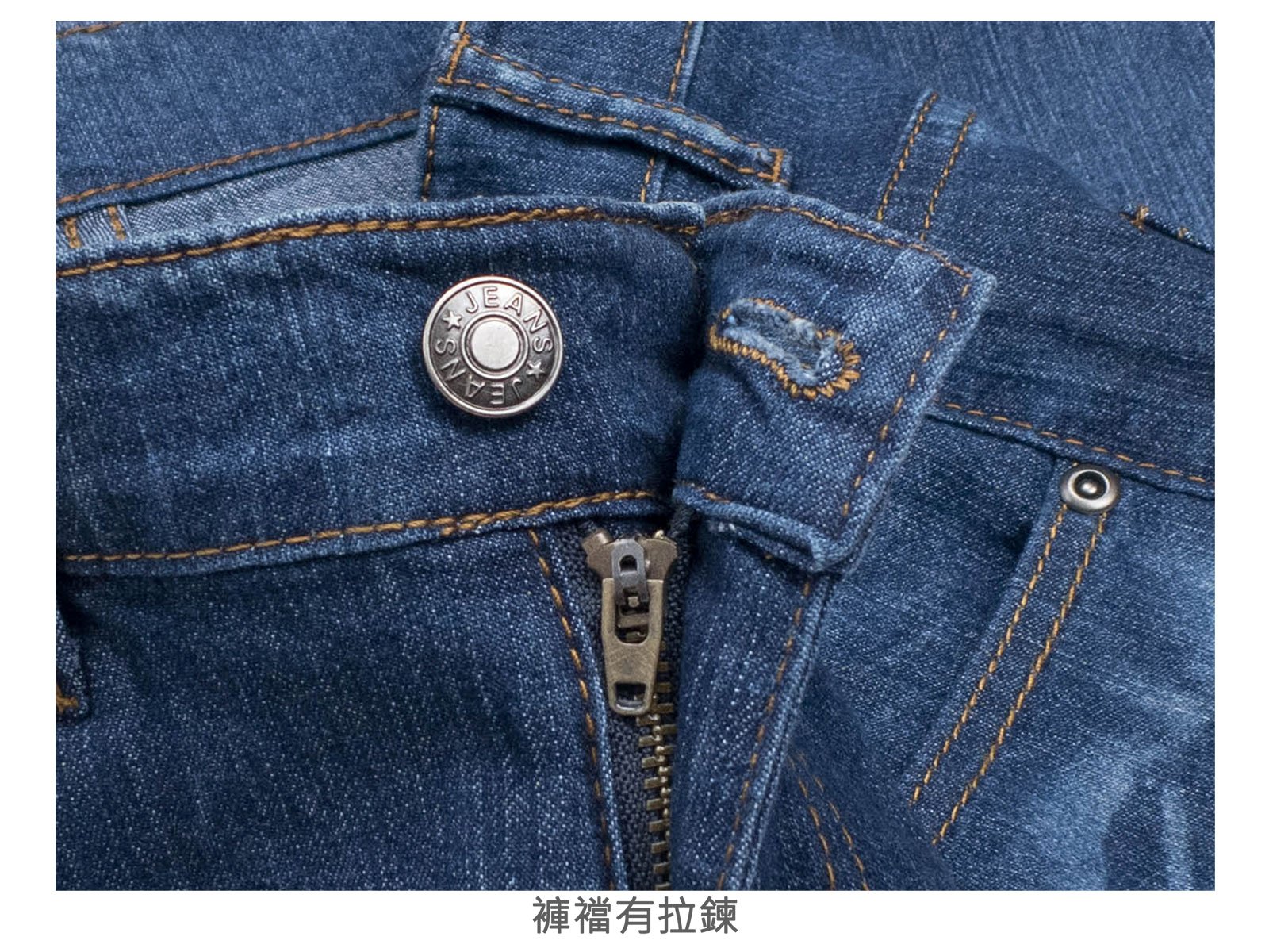 腰圍有皮帶環(褲耳)、褲檔有拉鍊。