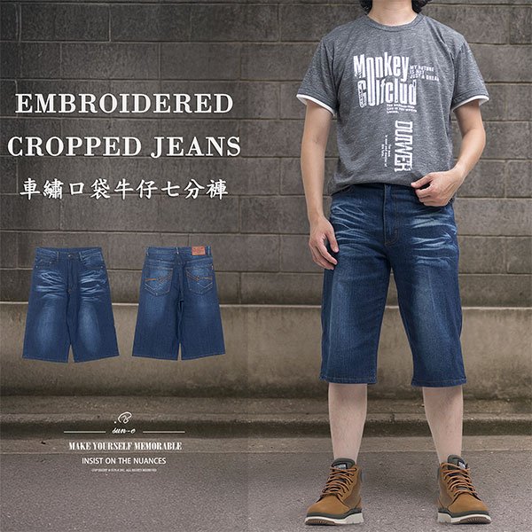sun-e七分牛仔褲、彈性牛仔短褲、牛仔七分褲、刷白牛仔褲、刷紋丹寧短褲、車繡後口袋、Cropped Jeans、Stretch Jean Shorts、Faded Streaks Faded Thighs Denim Shorts、Short Pants、Embroidered Pockets (307-7598-08)牛仔色 L XL 2L 3L 4L 5L (腰圍:30~41英吋 / 76~104公分) 男 [實體店面保障]