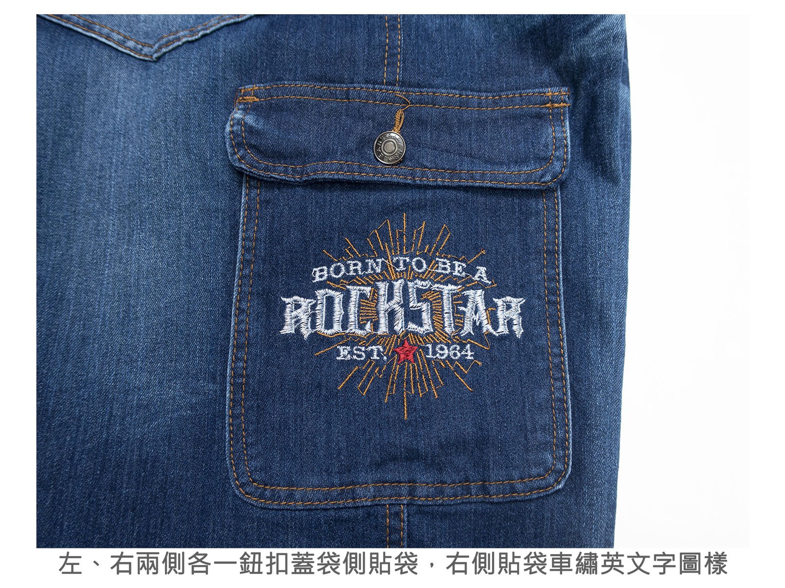 左、右兩側各一鈕扣蓋袋側貼袋,右側貼袋車繡英文字圖樣。
