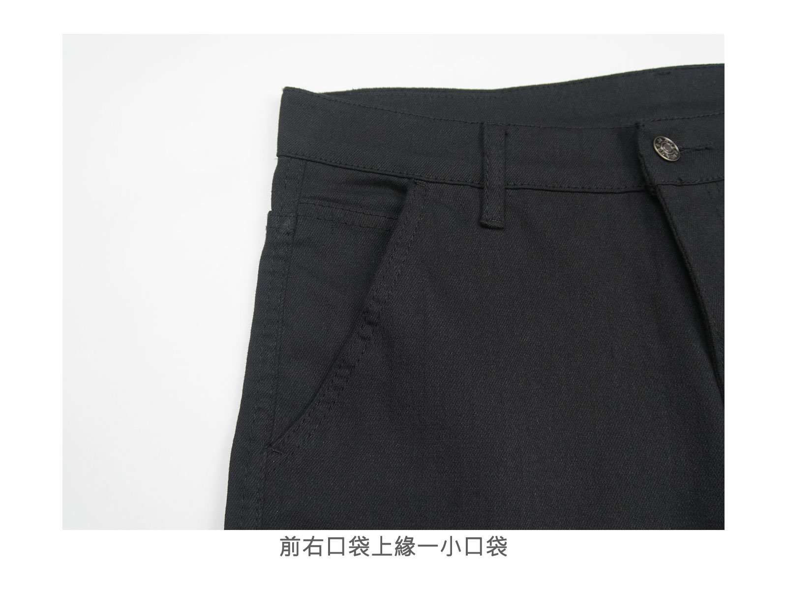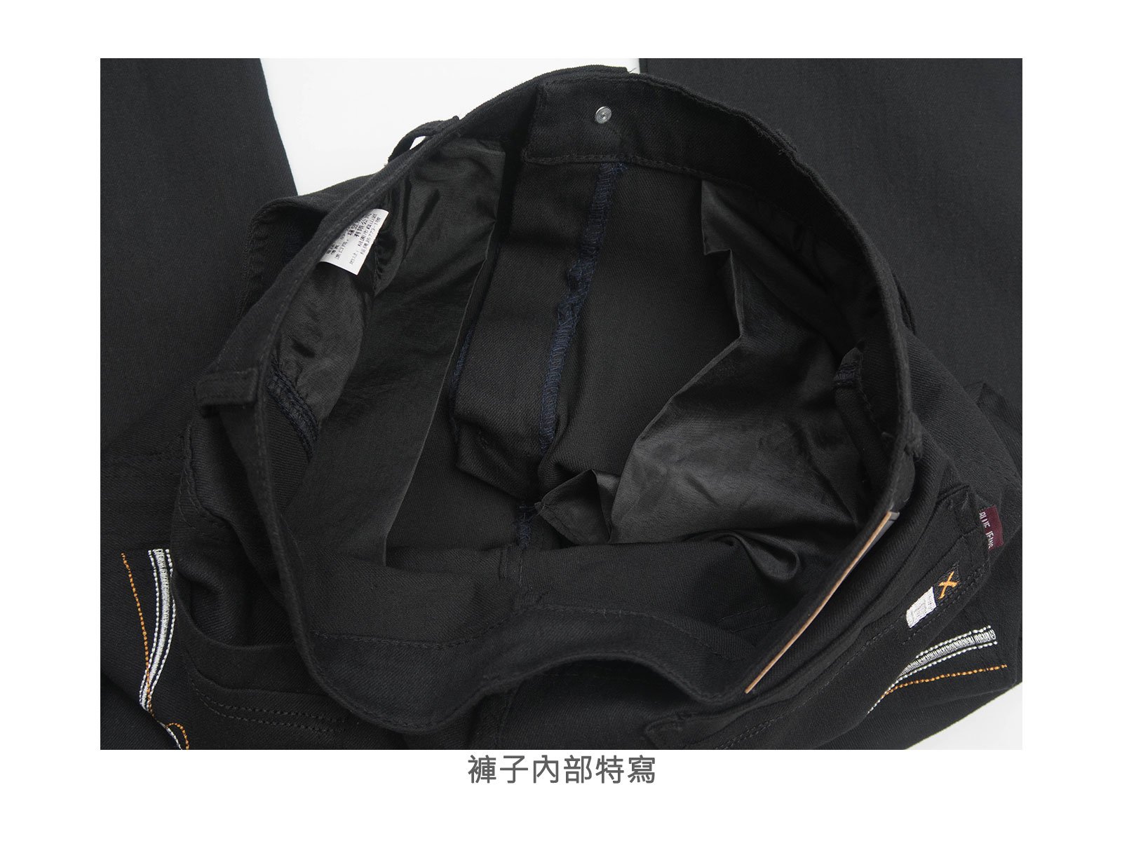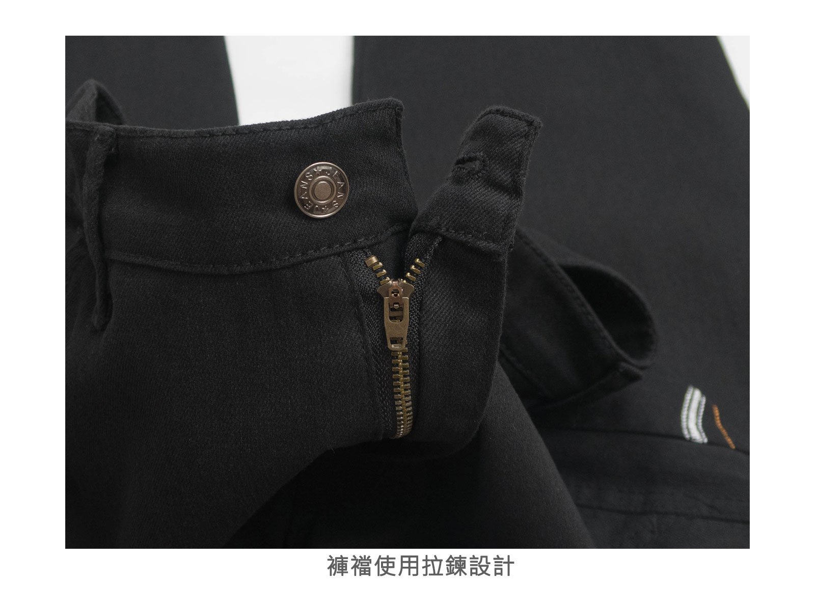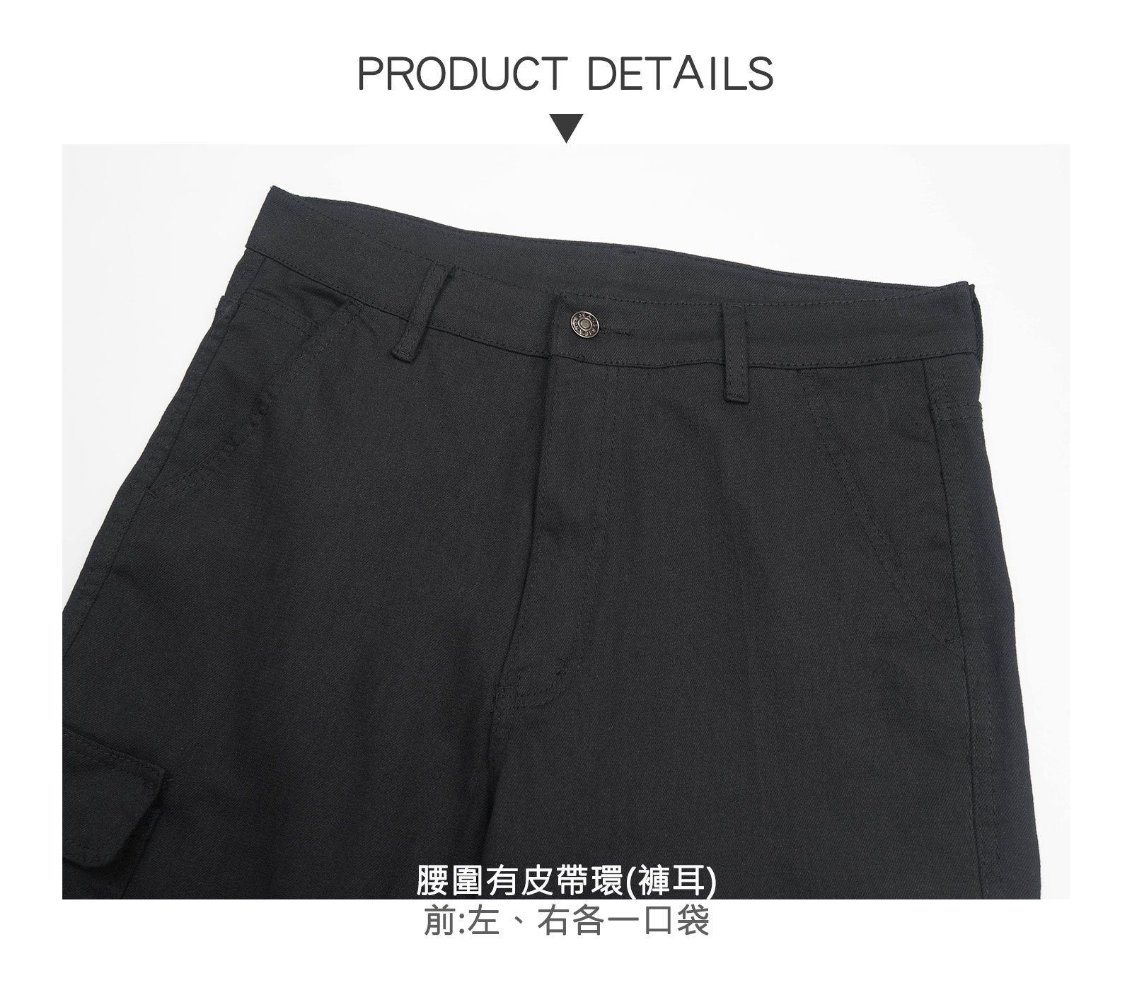 腰圍有皮帶環(褲耳)、褲檔使用拉鍊設計。