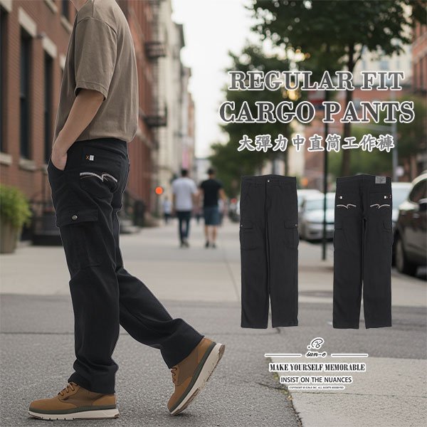 sun-e大彈力中直筒工作褲 中直筒休閒褲 側袋褲 多口袋工作長褲 工裝褲 側邊口袋褲 車繡口袋側貼袋休閒長褲 彈性長褲 直筒褲 口袋褲 Stretch Cargo Pants Regular Fit Trousers Casual Pants (307-7625-21)黑色 M L XL 2L 3L 4L 5L (腰圍:28~41英吋 / 71~104公分) 男 [實體店面保障]