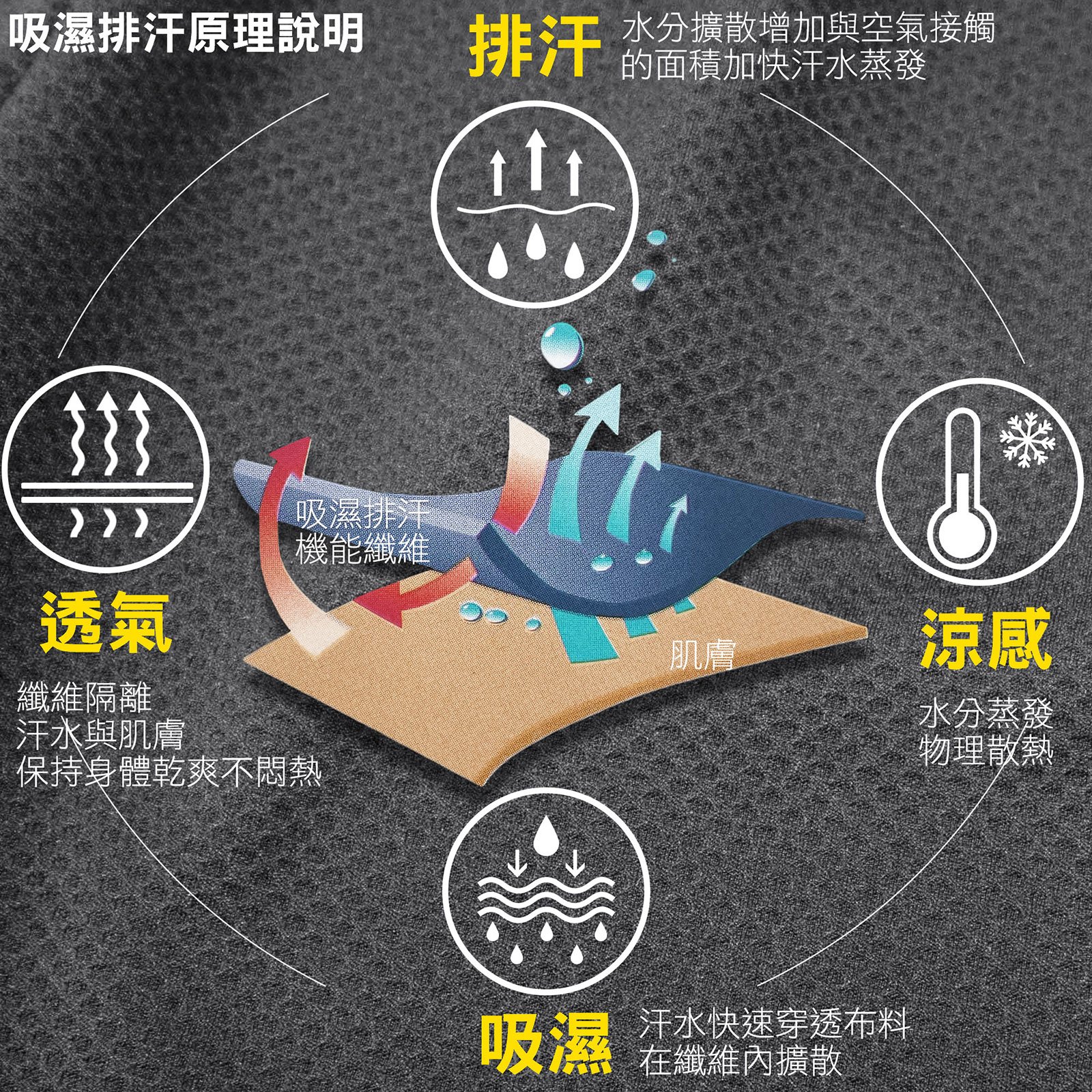 具汗水迅速蒸發,易洗快乾,纖維不易變形等優點。