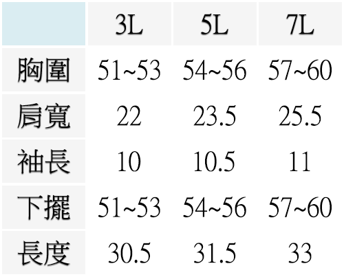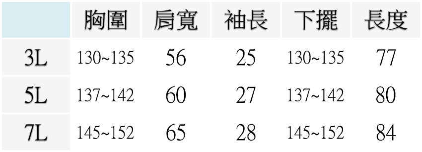 3L ( 胸圍51~53英吋 / 130~135公分 ), 5L ( 胸圍54~56英吋 / 137~142公分 ), 7L ( 胸圍57~60英吋 / 145~152公分 )