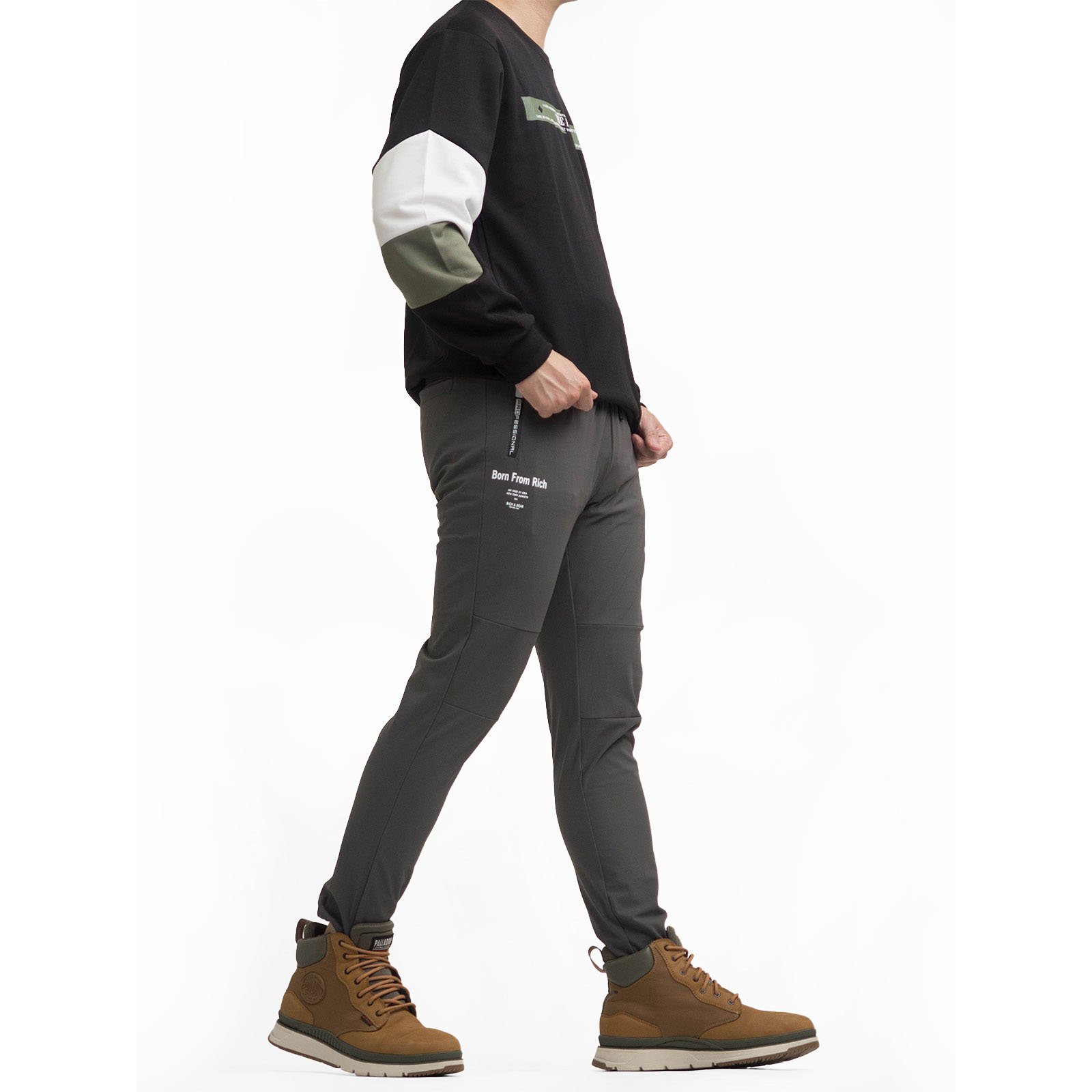 顯瘦韓系潮流束腳休閒長褲,彈力布料搭配全鬆緊腰設計,時尚運動風格舒適,個性品味穿著。