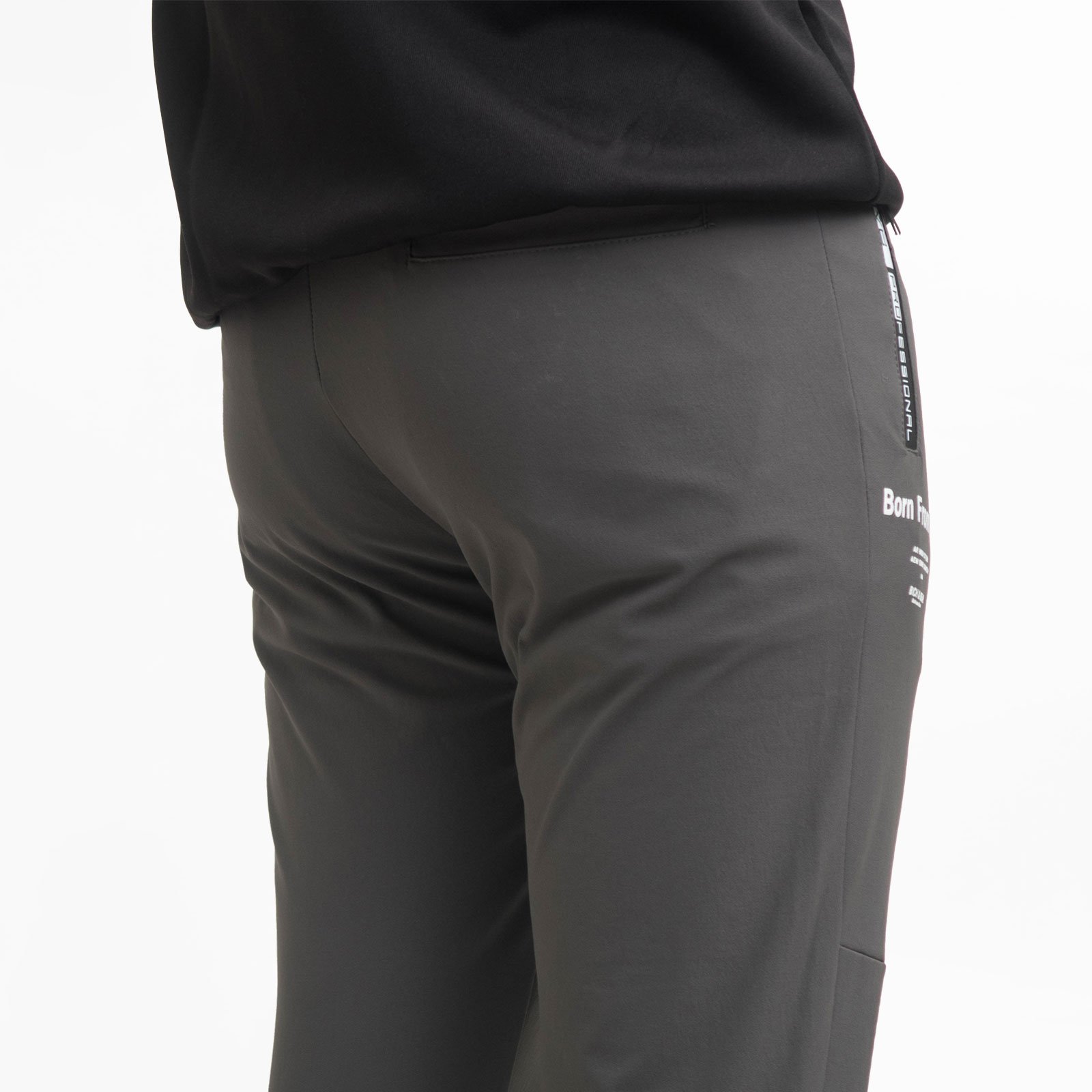 前右側褲管旁膠印英文字樣。