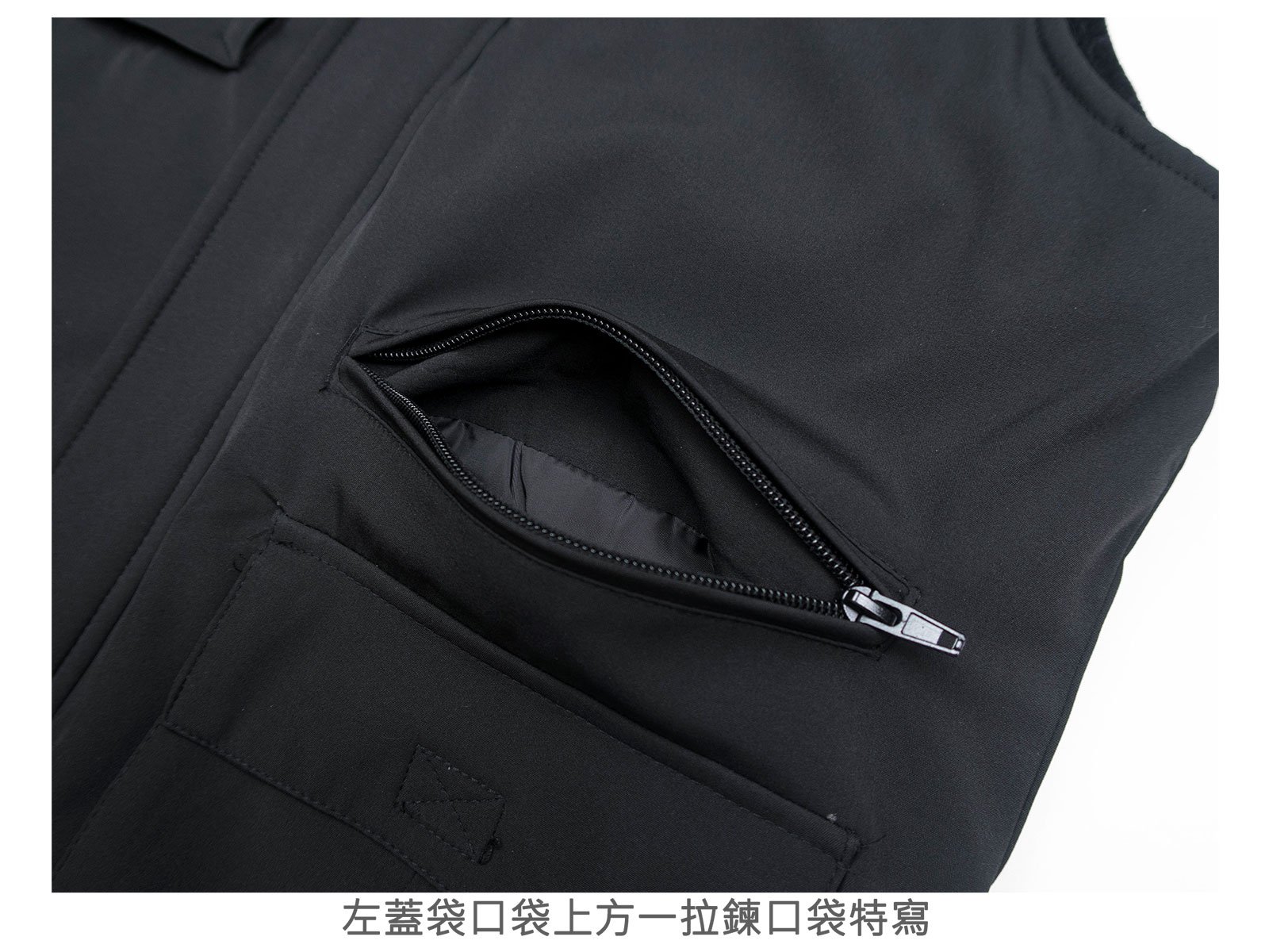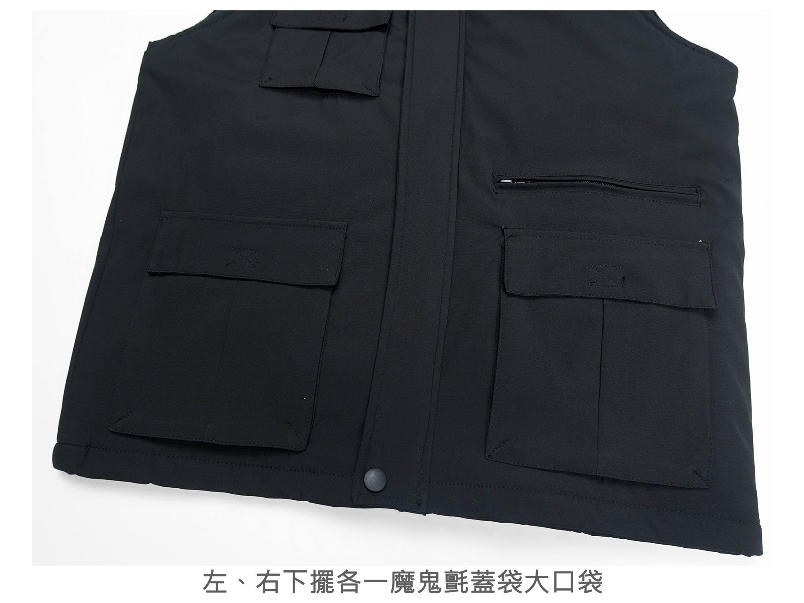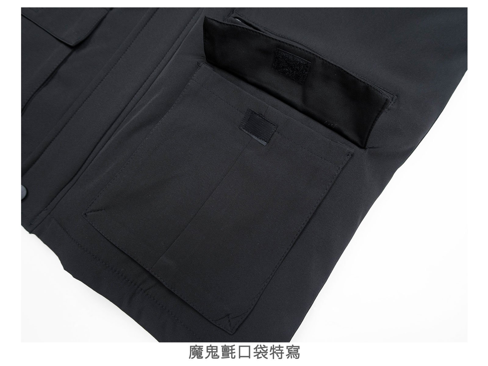 左、右下擺各一魔鬼氈蓋袋大口袋,左蓋袋口袋上方一拉鍊口袋。