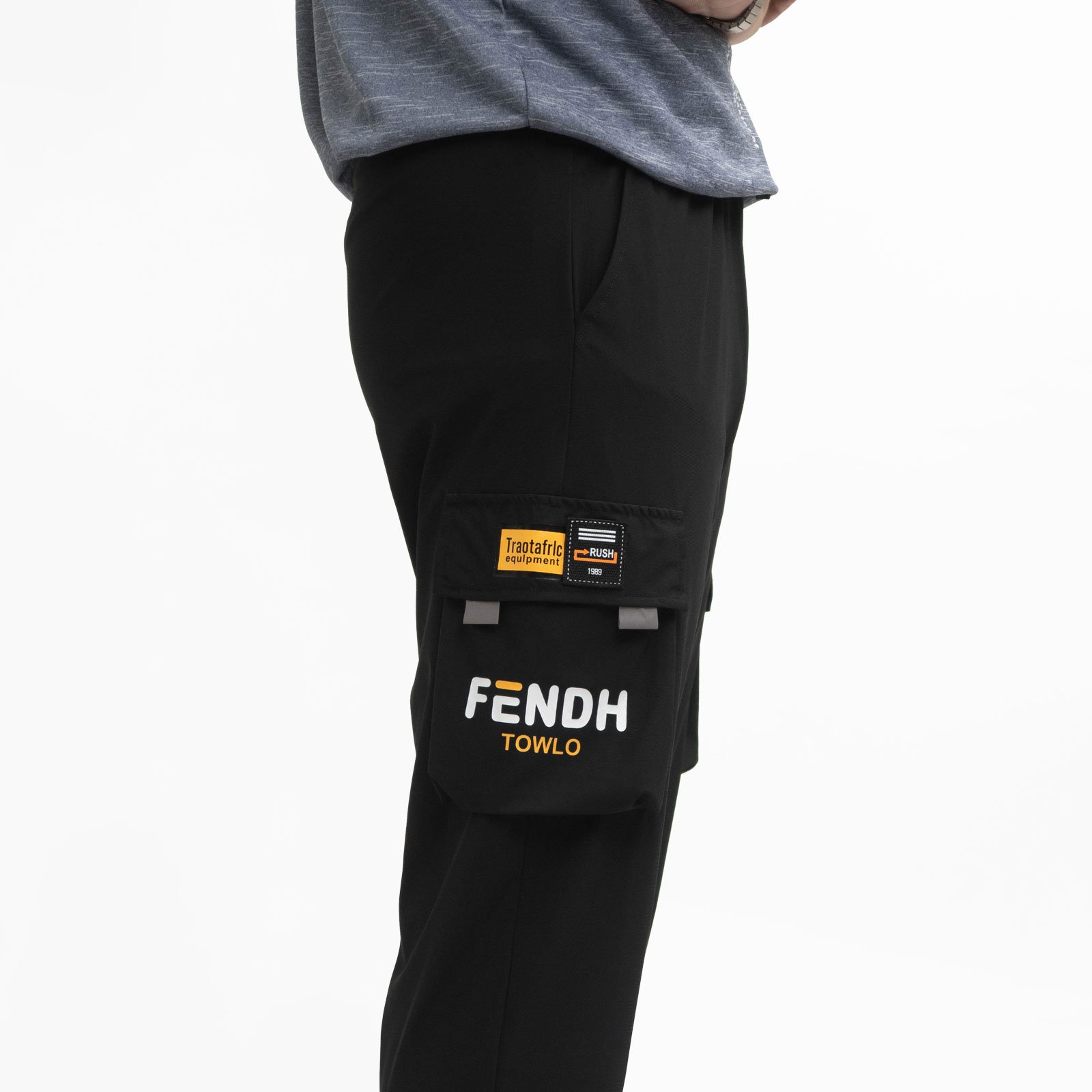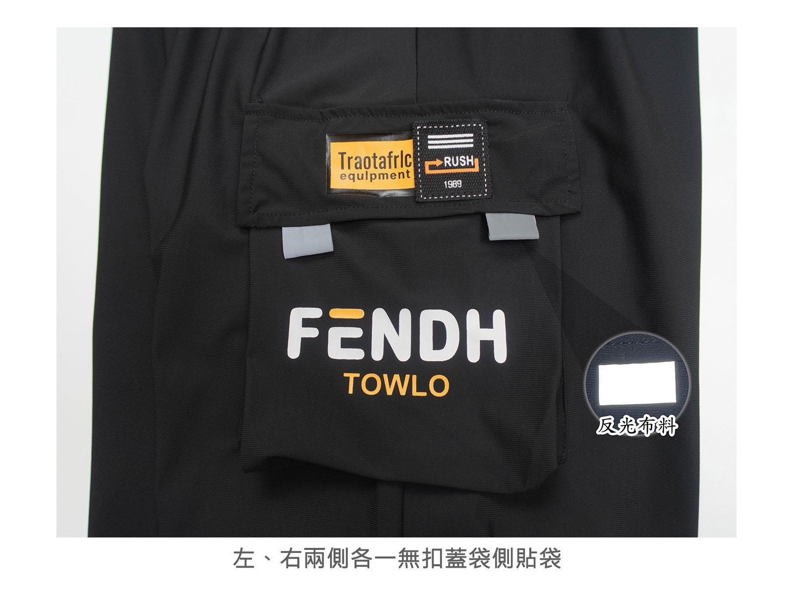 左、右兩側各一無扣蓋袋側貼袋,搭配英文印花、貼標與反光布料設計。