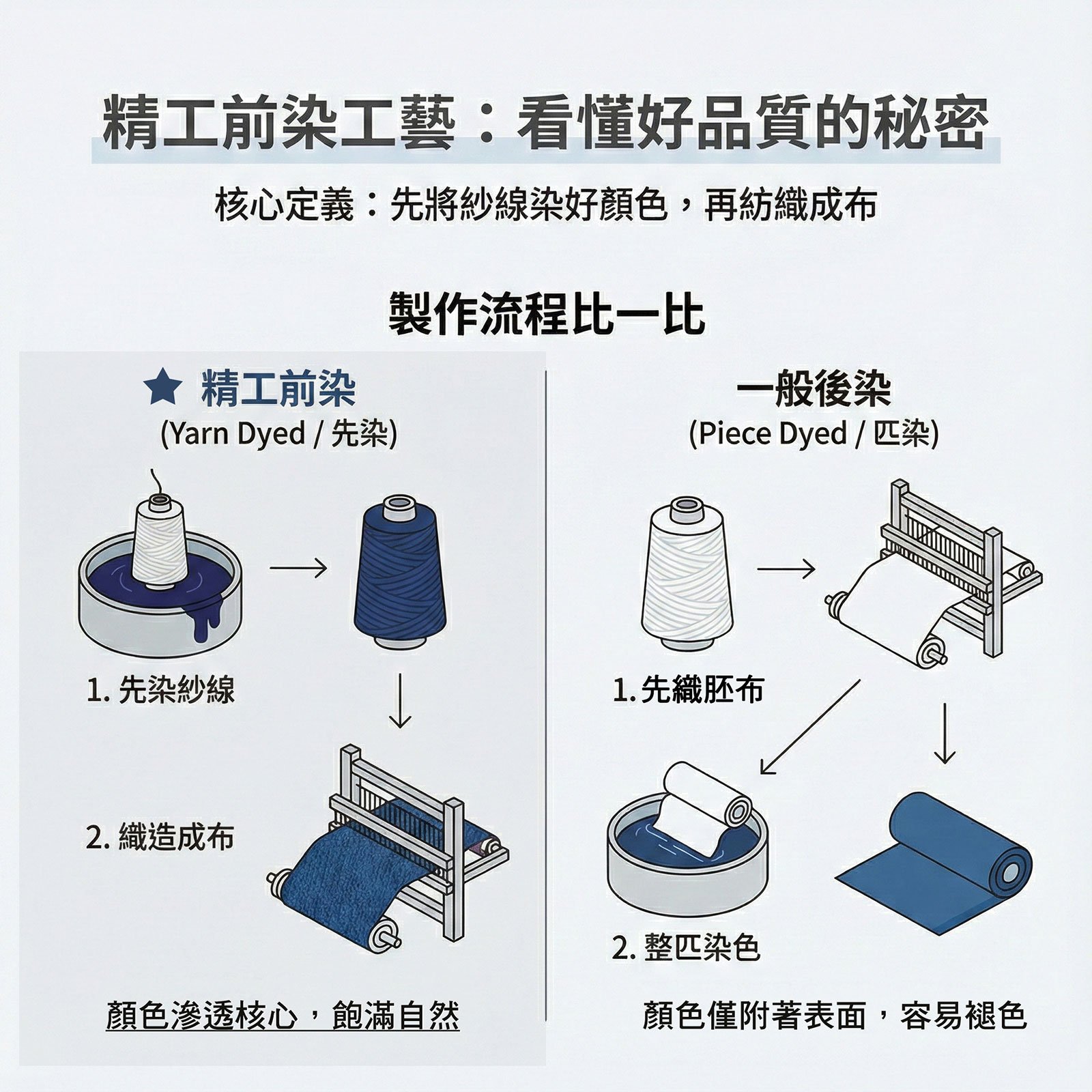 以先染紗、後紡織的工法,讓染料徹底滲透紗線核心,