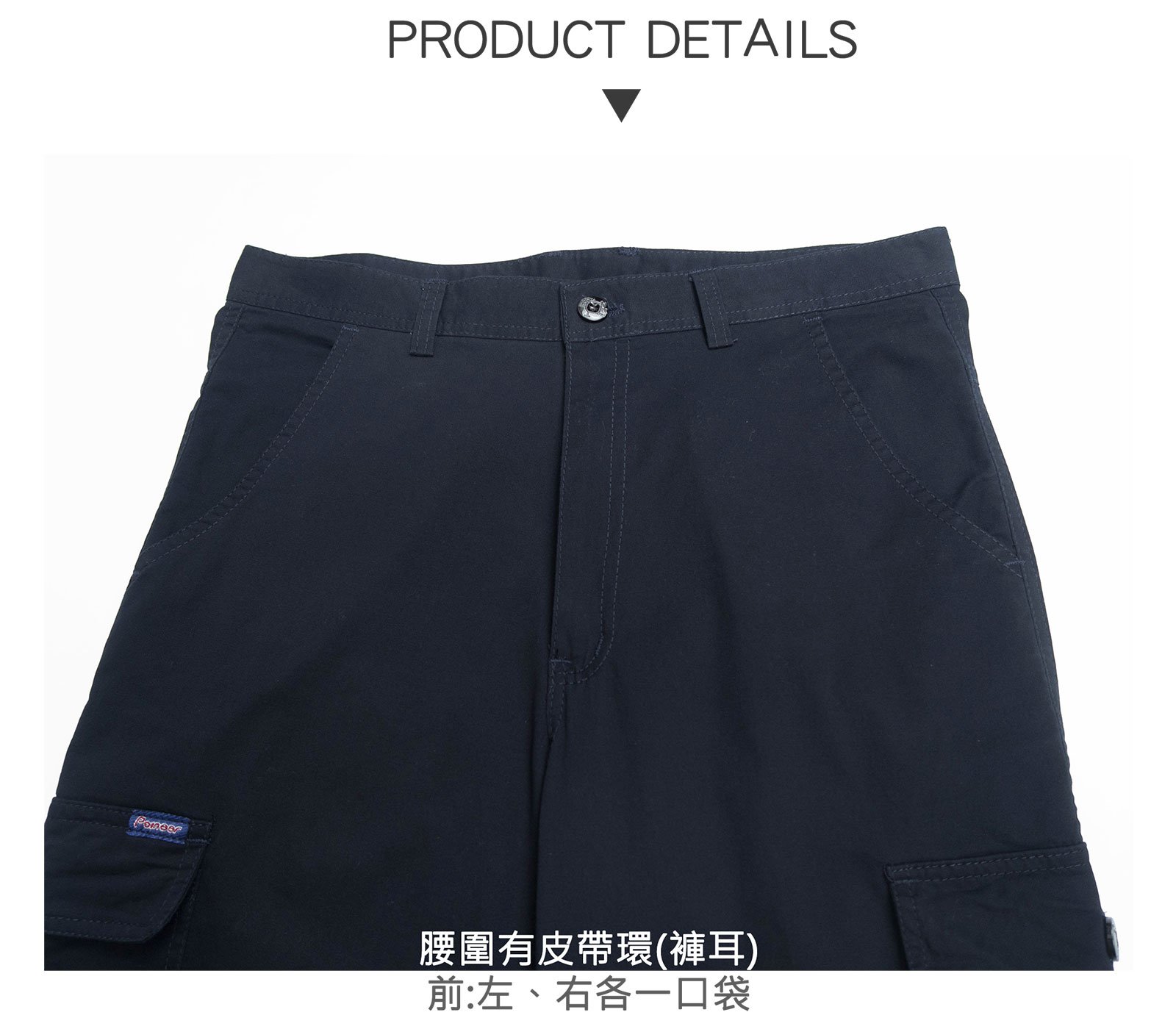 腰圍有皮帶環(褲耳)、褲檔有拉鍊。