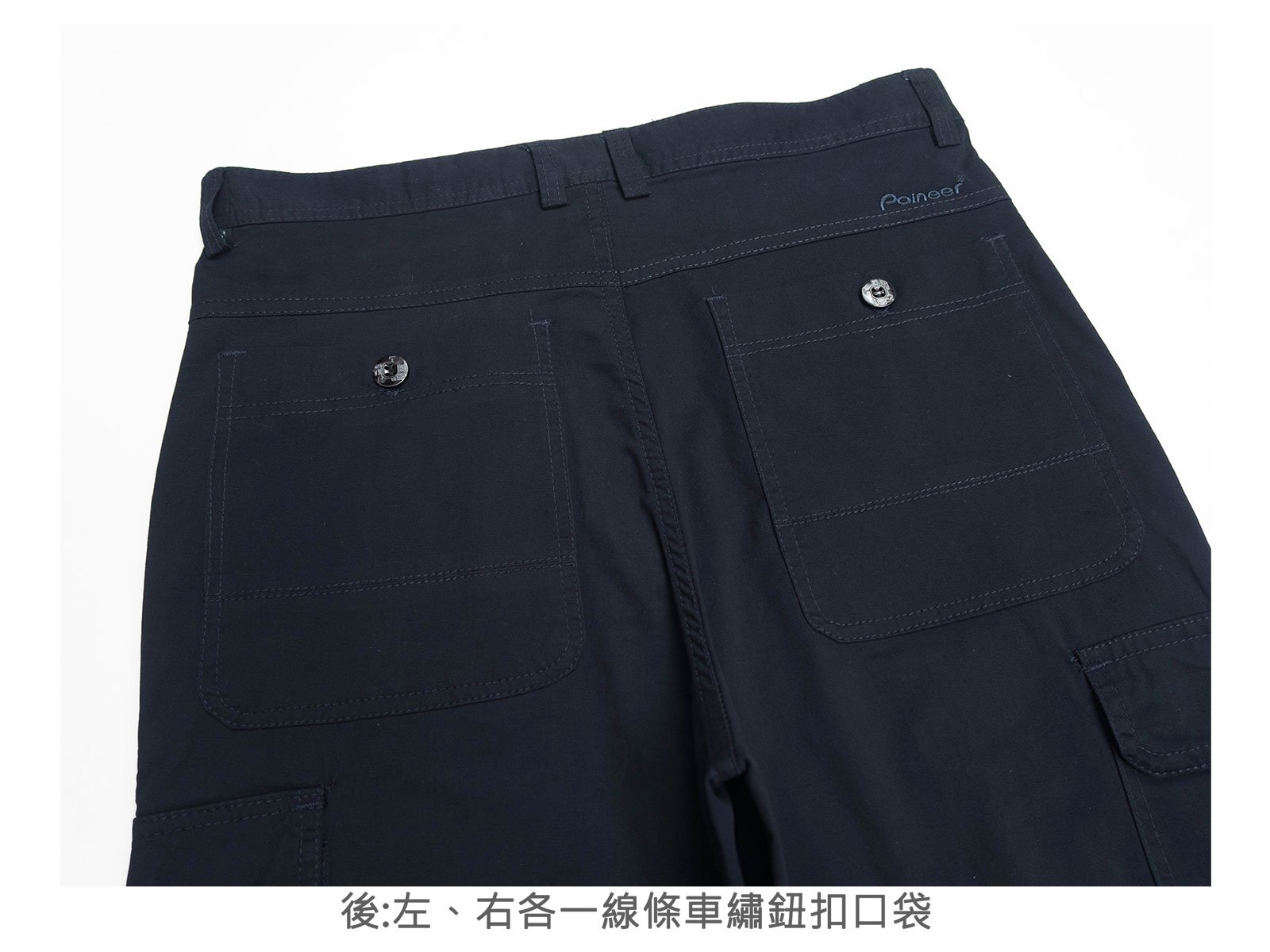 後:左、右各一線條車繡鈕扣口袋。