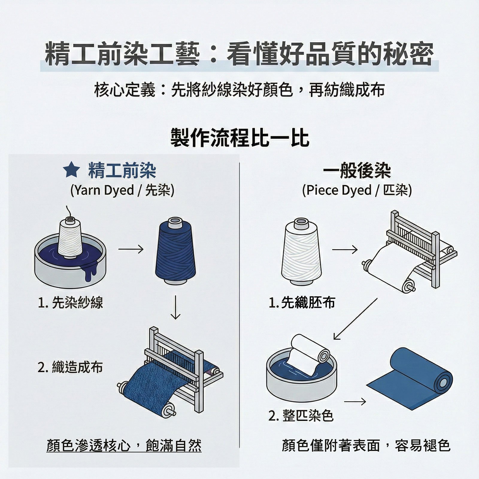 以先染紗、後紡織的工法,讓染料徹底滲透紗線核心,