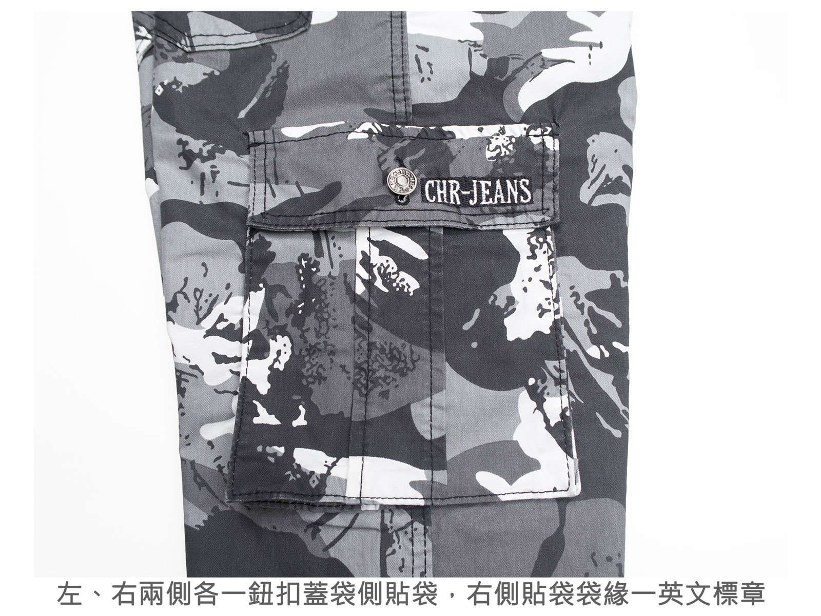 左、右兩側各一鈕扣蓋袋側貼袋,右側貼袋袋緣一英文標章。