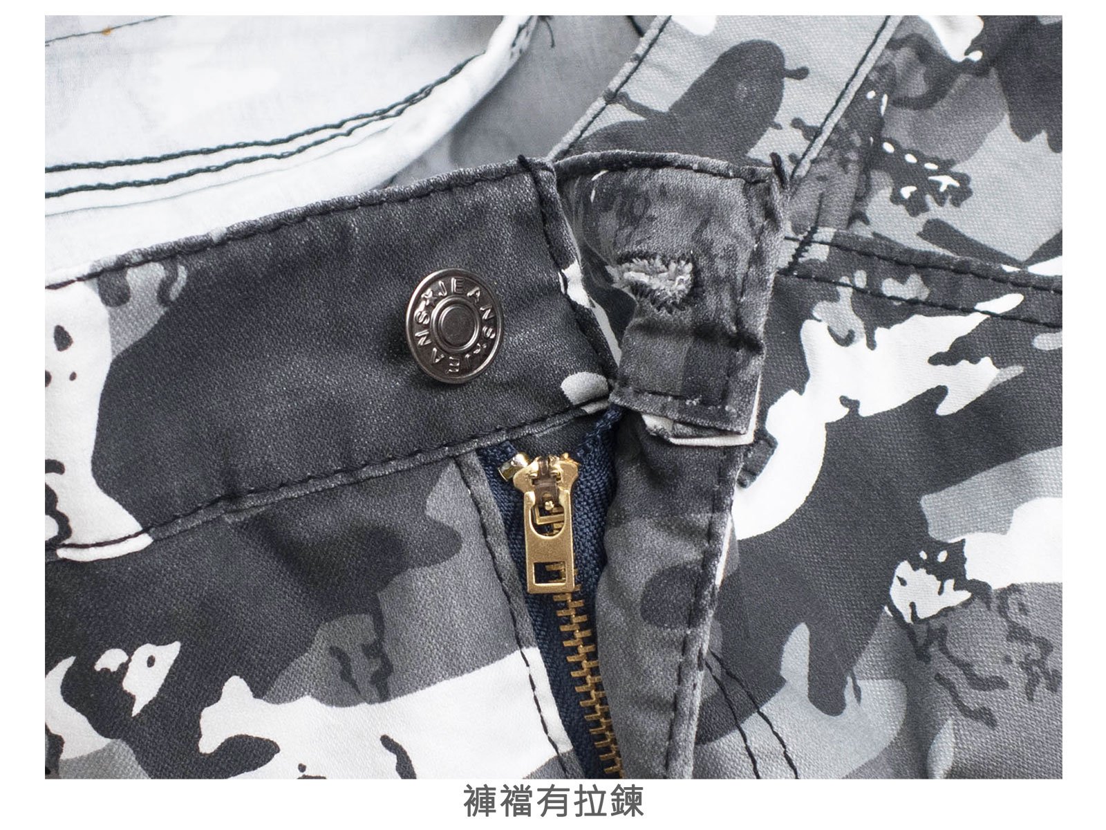 腰圍有皮帶環(褲耳)、褲檔有拉鍊。