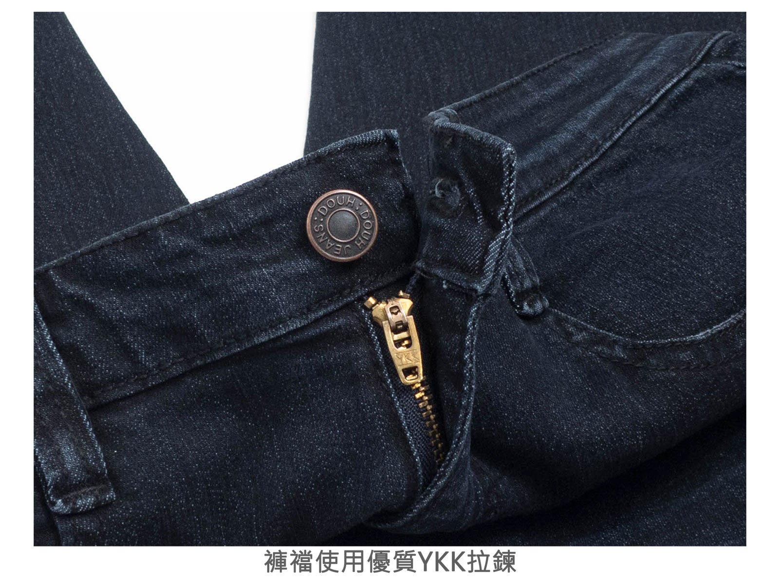 腰圍有皮帶環(褲耳)、褲檔使用優質YKK拉鍊。
