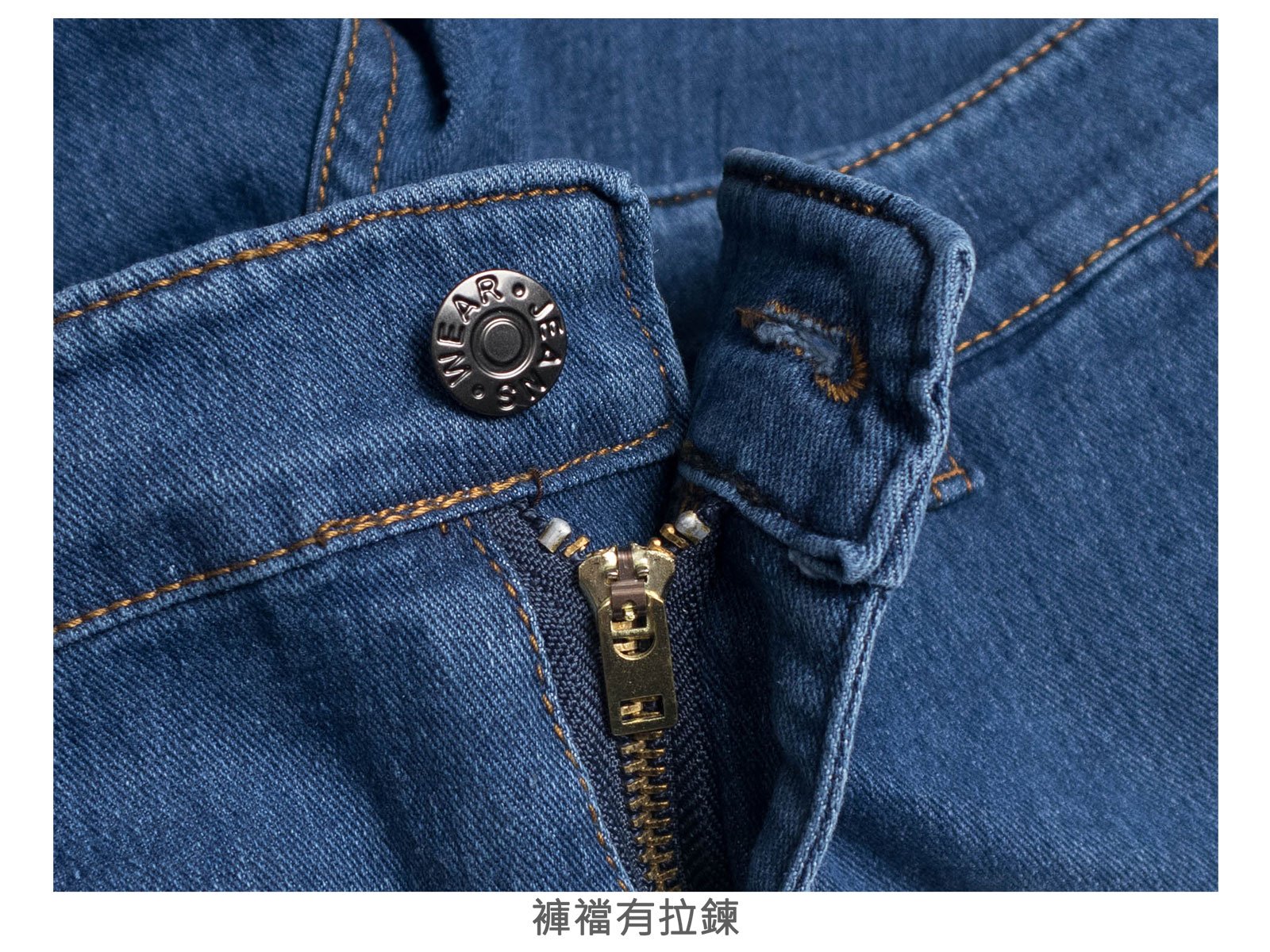 腰圍有皮帶環(褲耳)、褲檔有拉鍊。