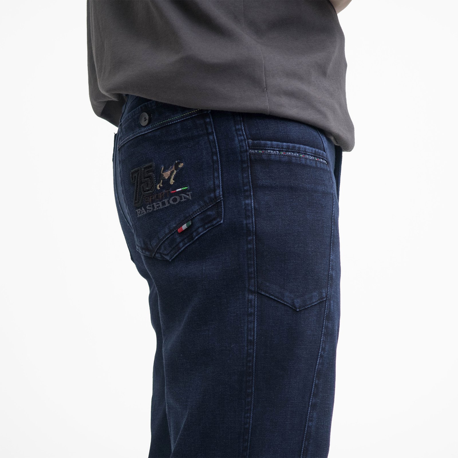 右口袋圖樣、英文字車繡。