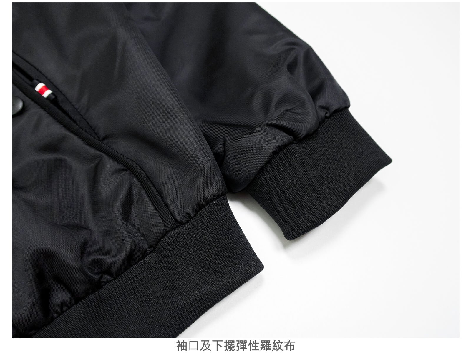 領口、袖口、下擺彈性羅紋布。